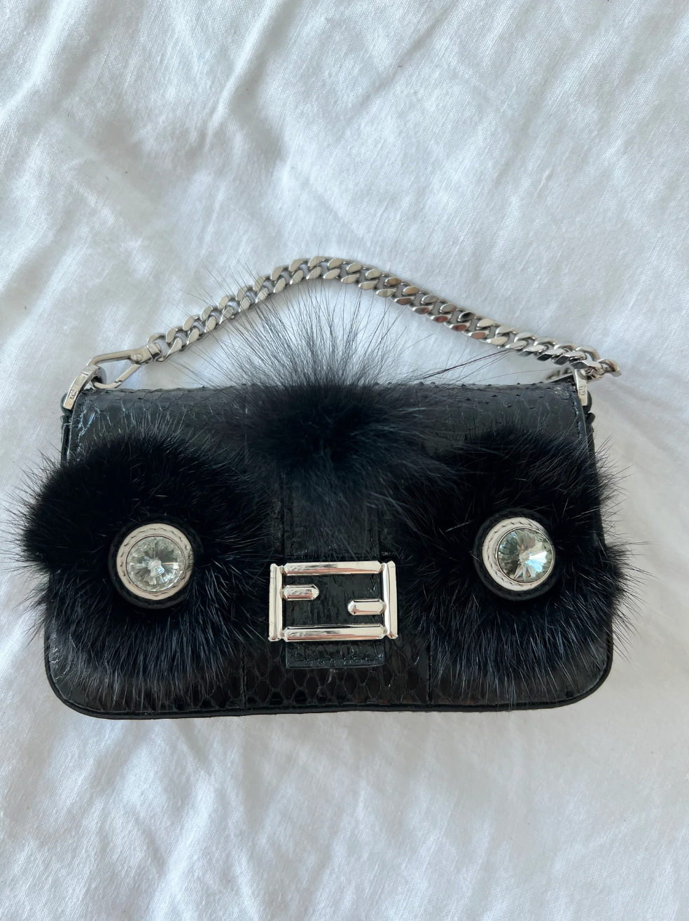 Black Fendi mini baguette with short adjustable silver chain. Comes with removable black longer shoulder strap. Real fur.