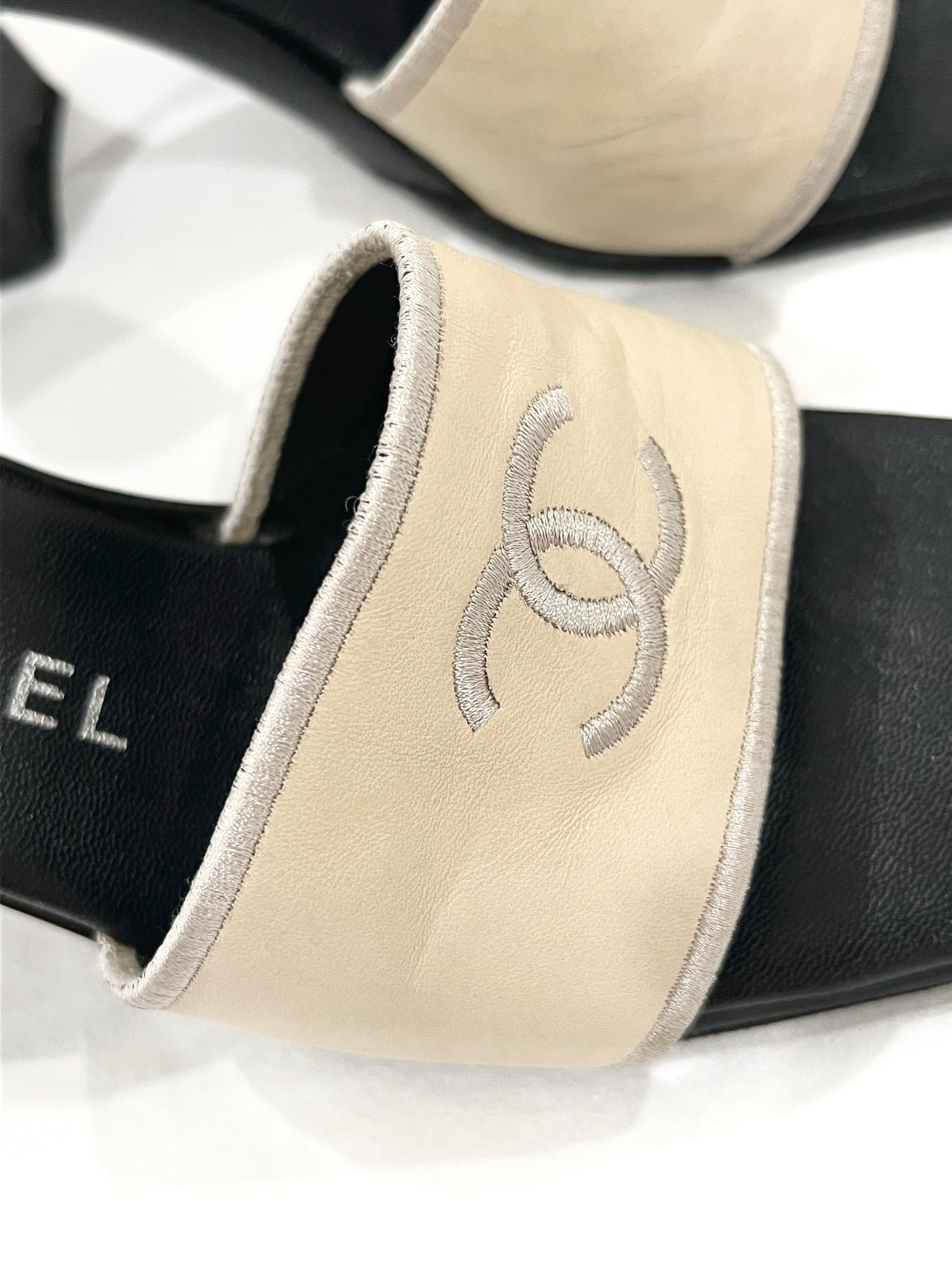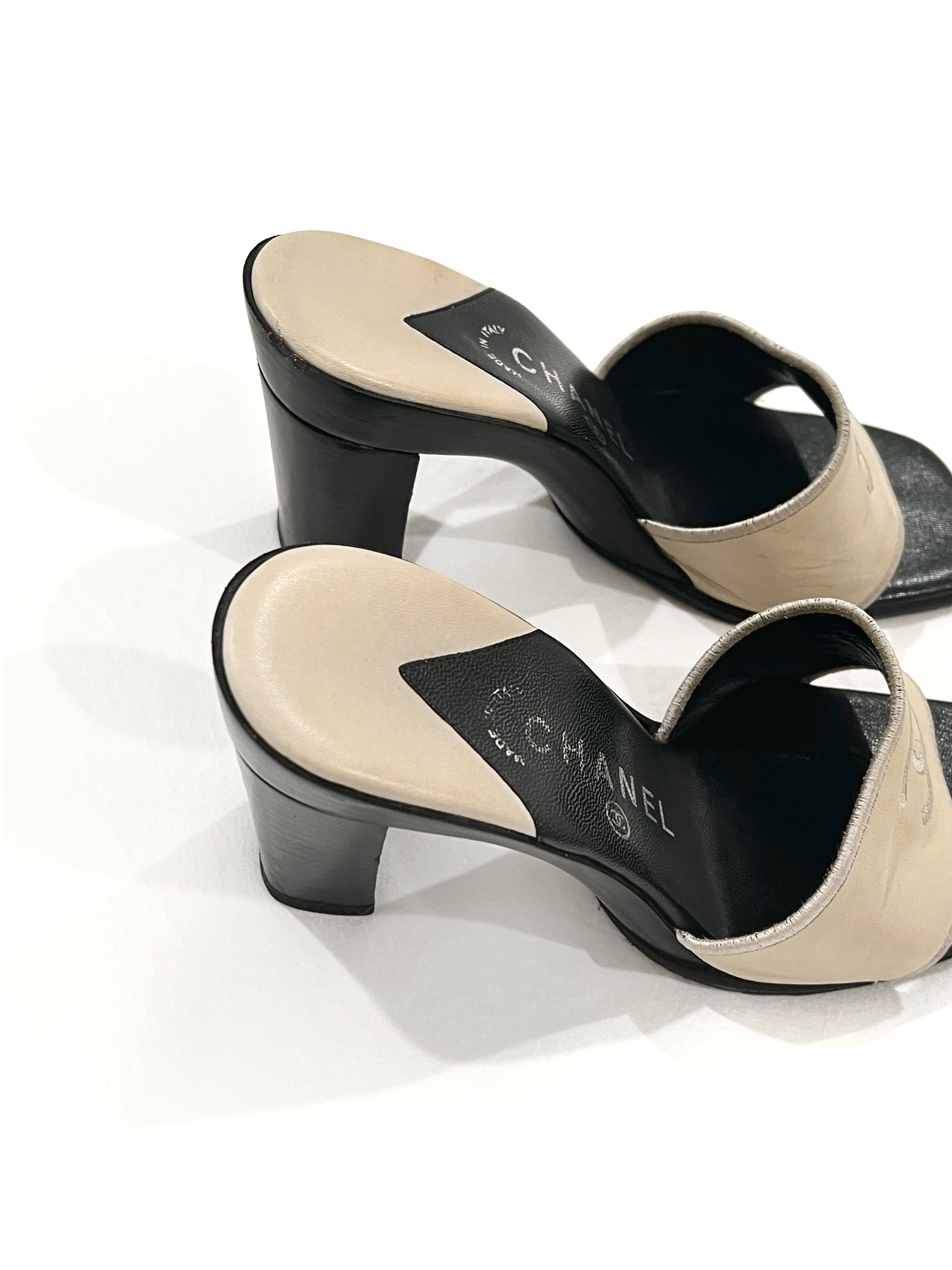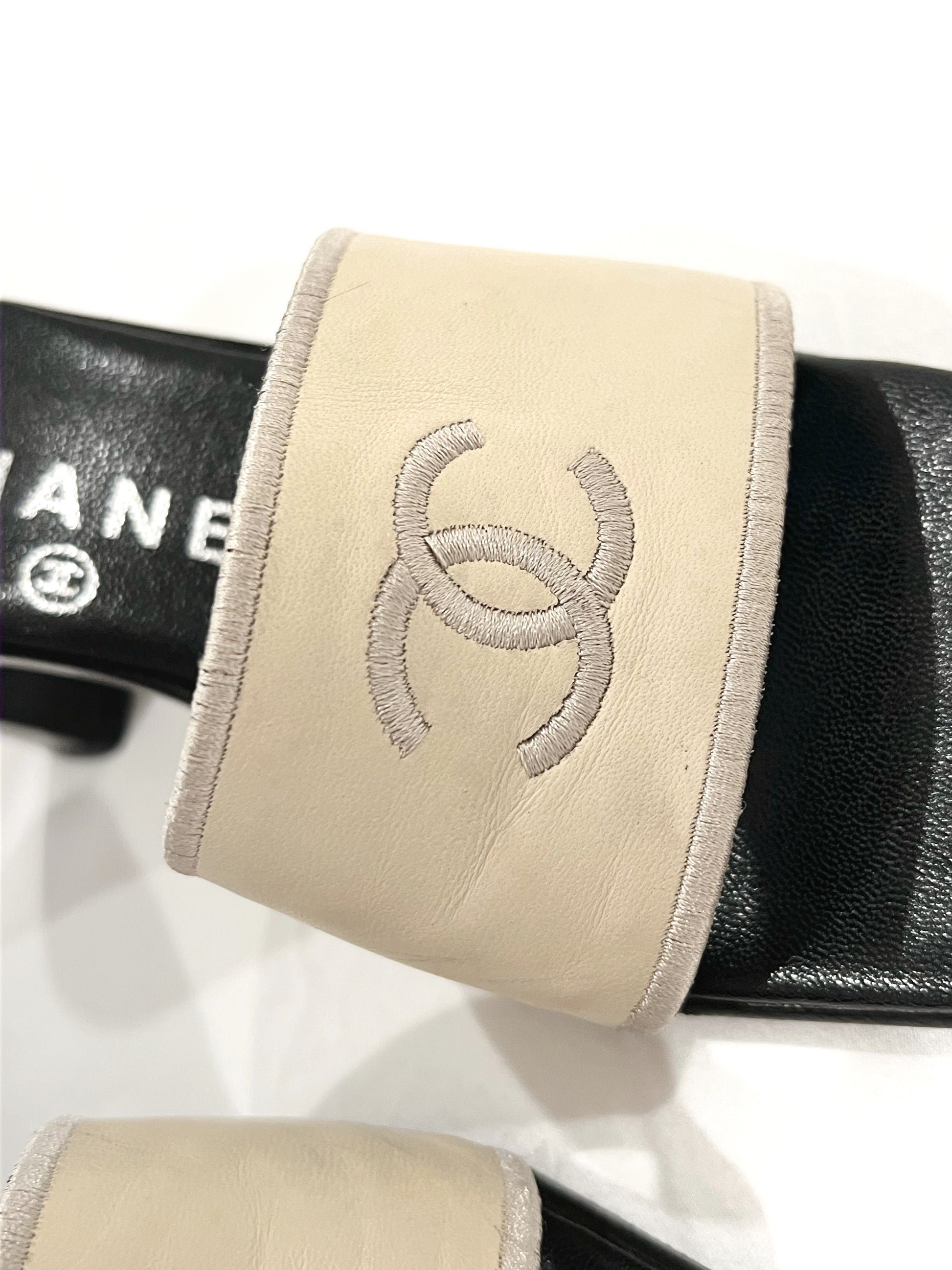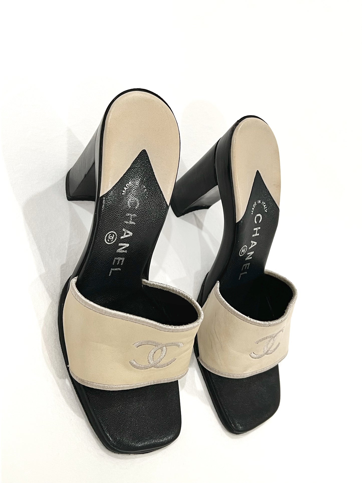 Size 37C. Off-white Chanel Logo mules. Chunky black heels.