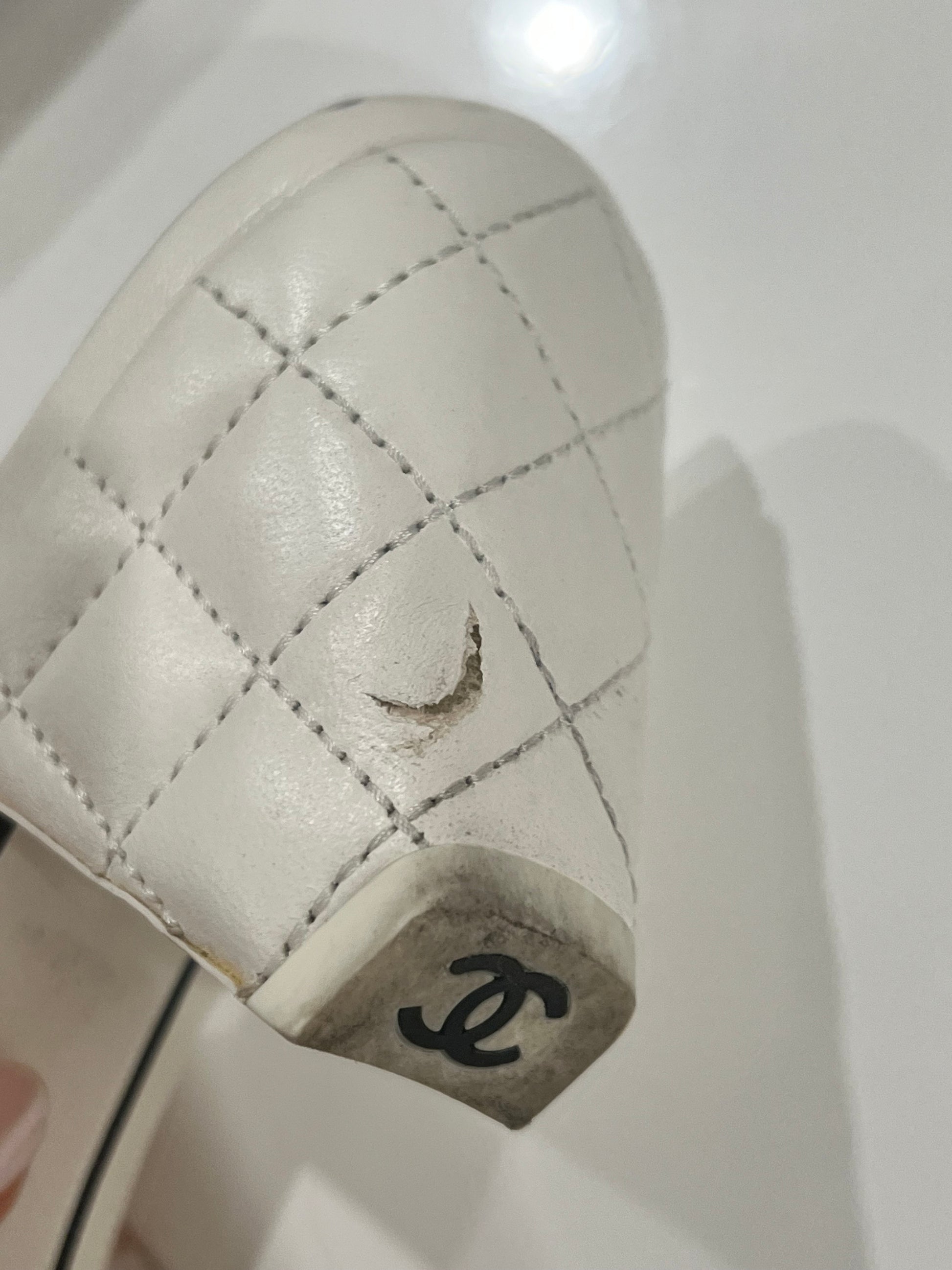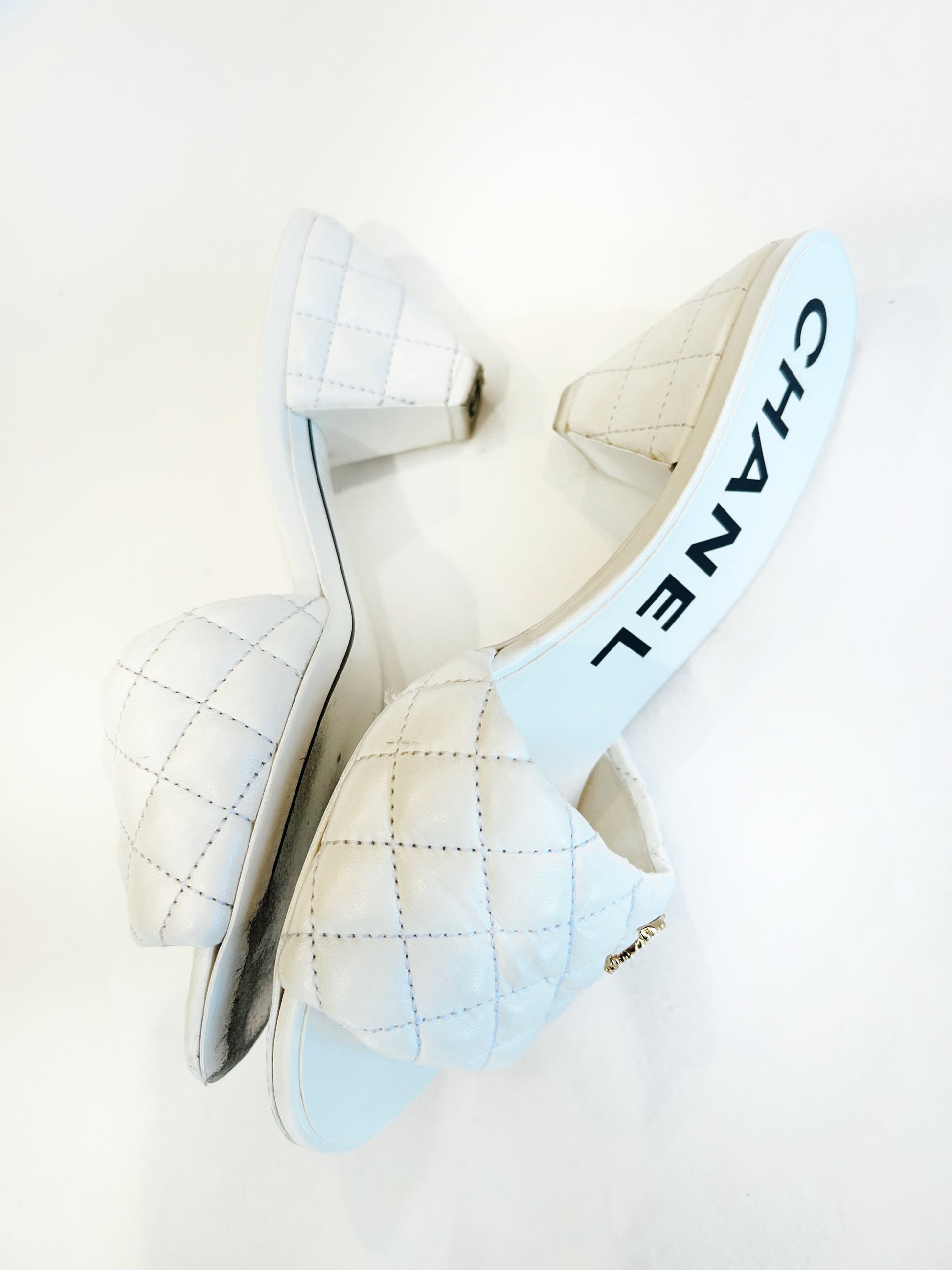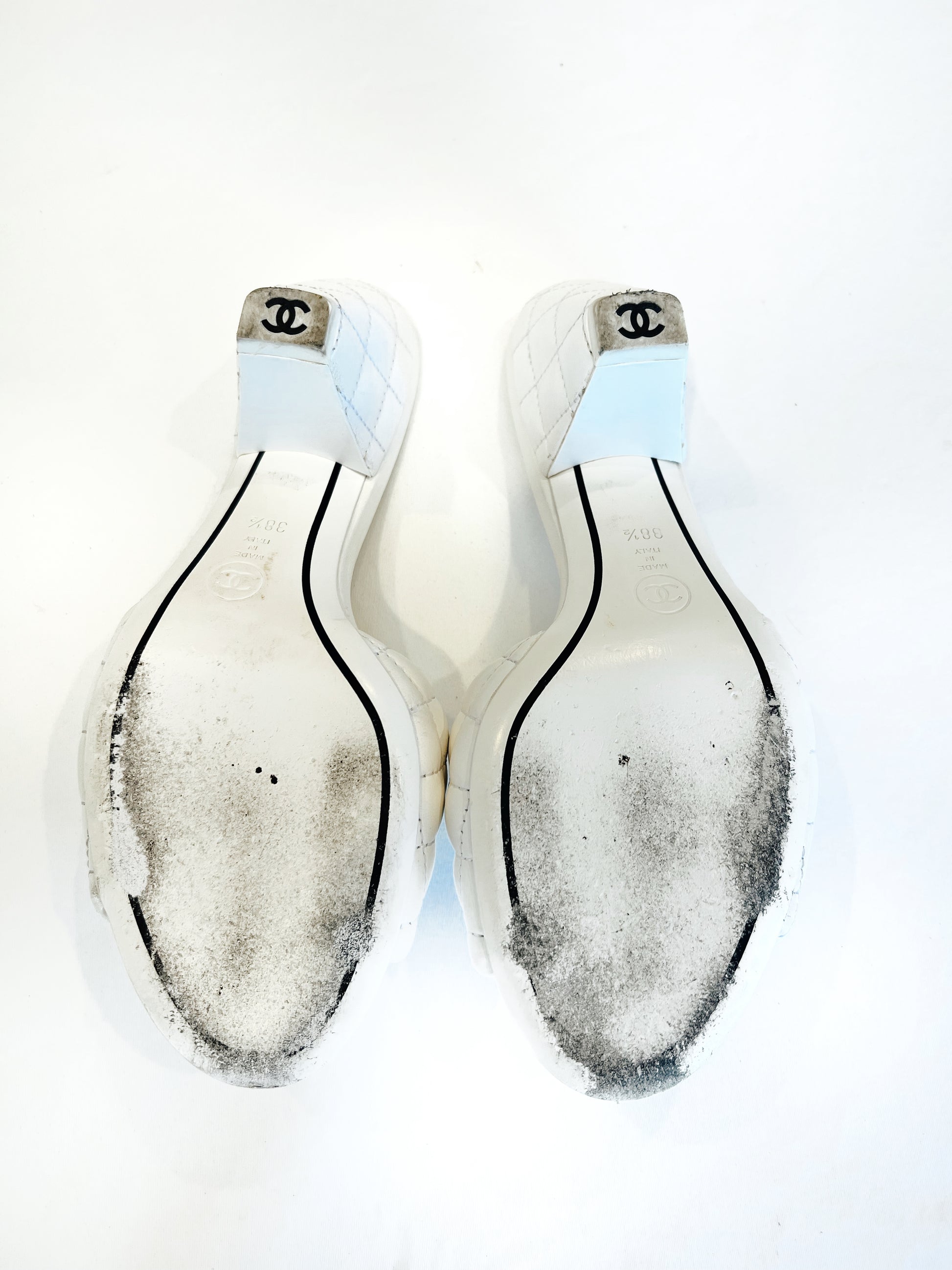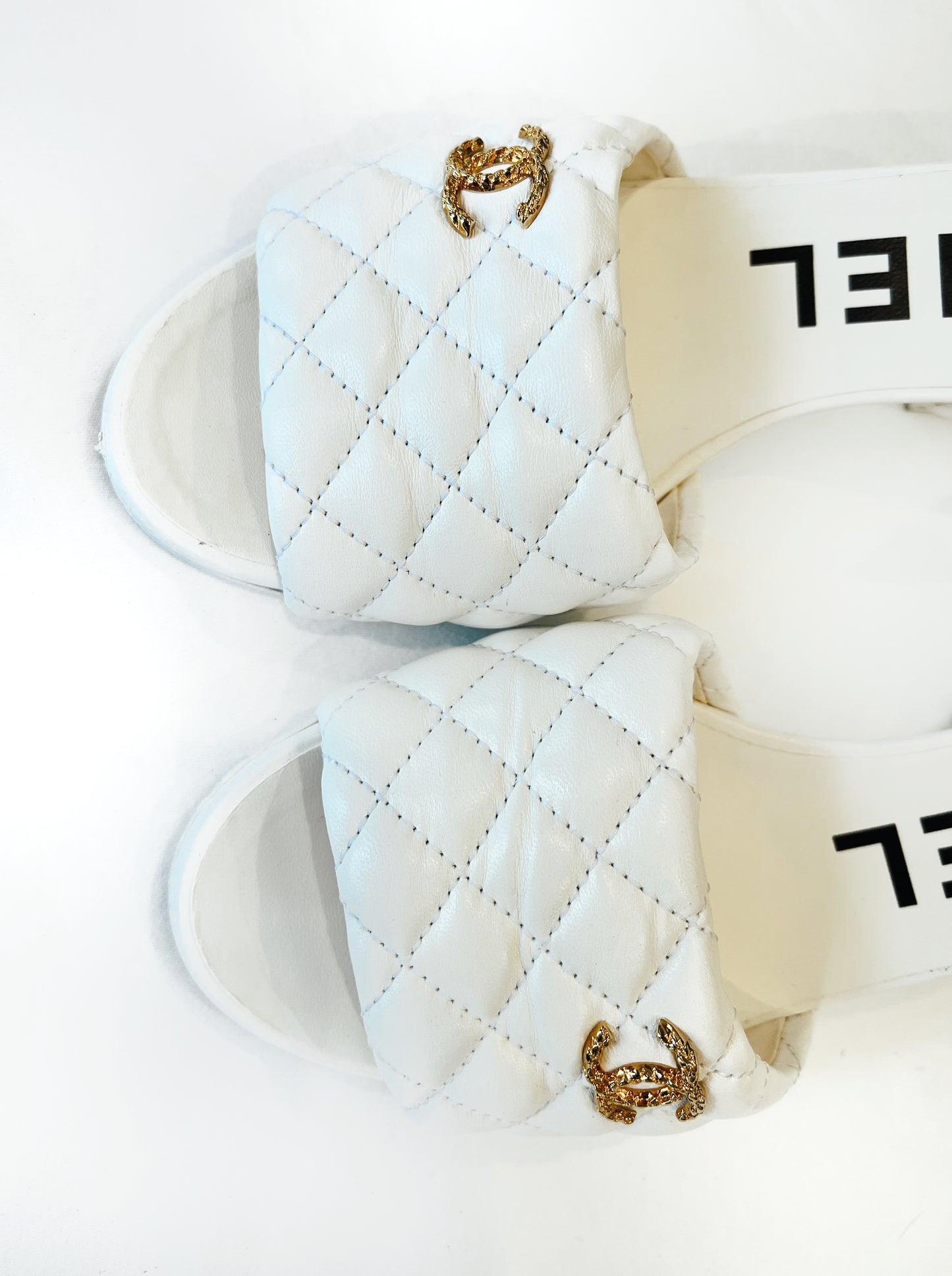 Size 38.5. White quilted Chanel kitten heel slides. Perfect bridal heels. Gold details