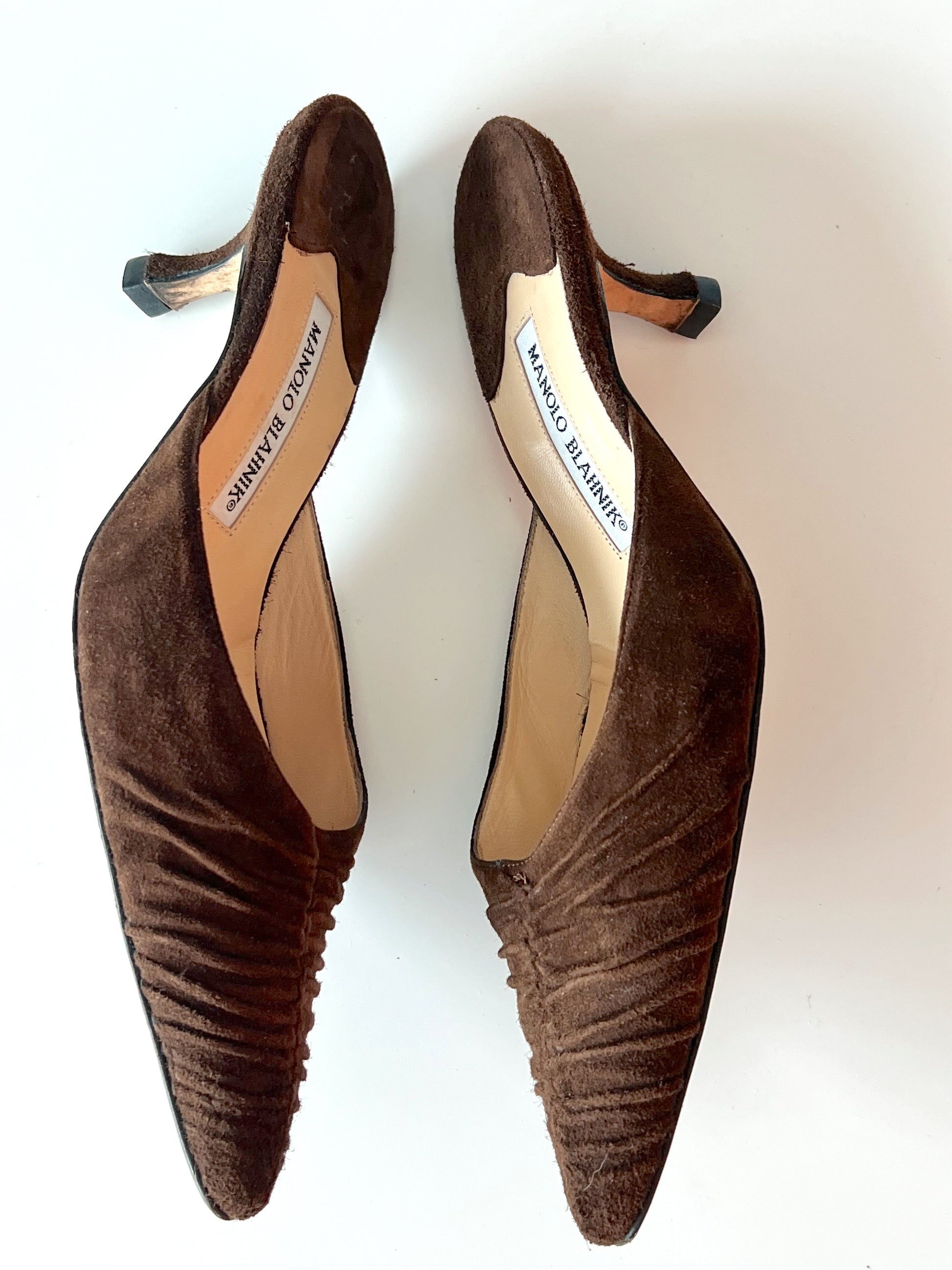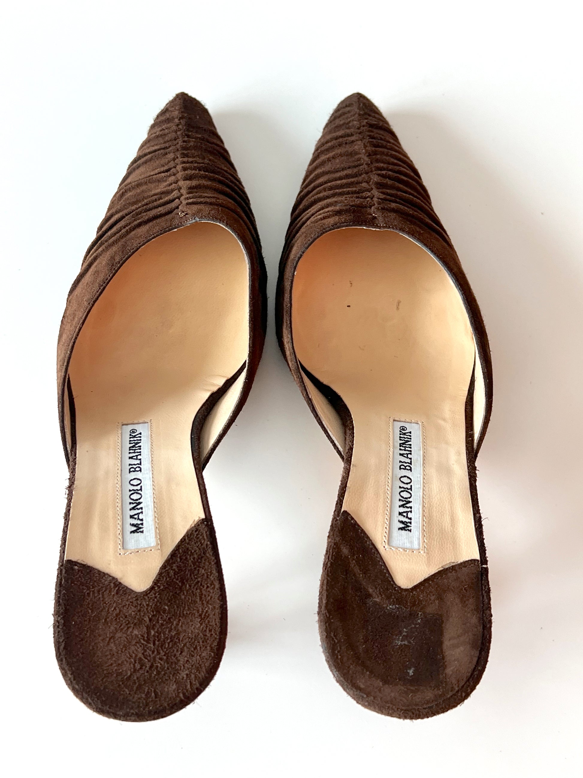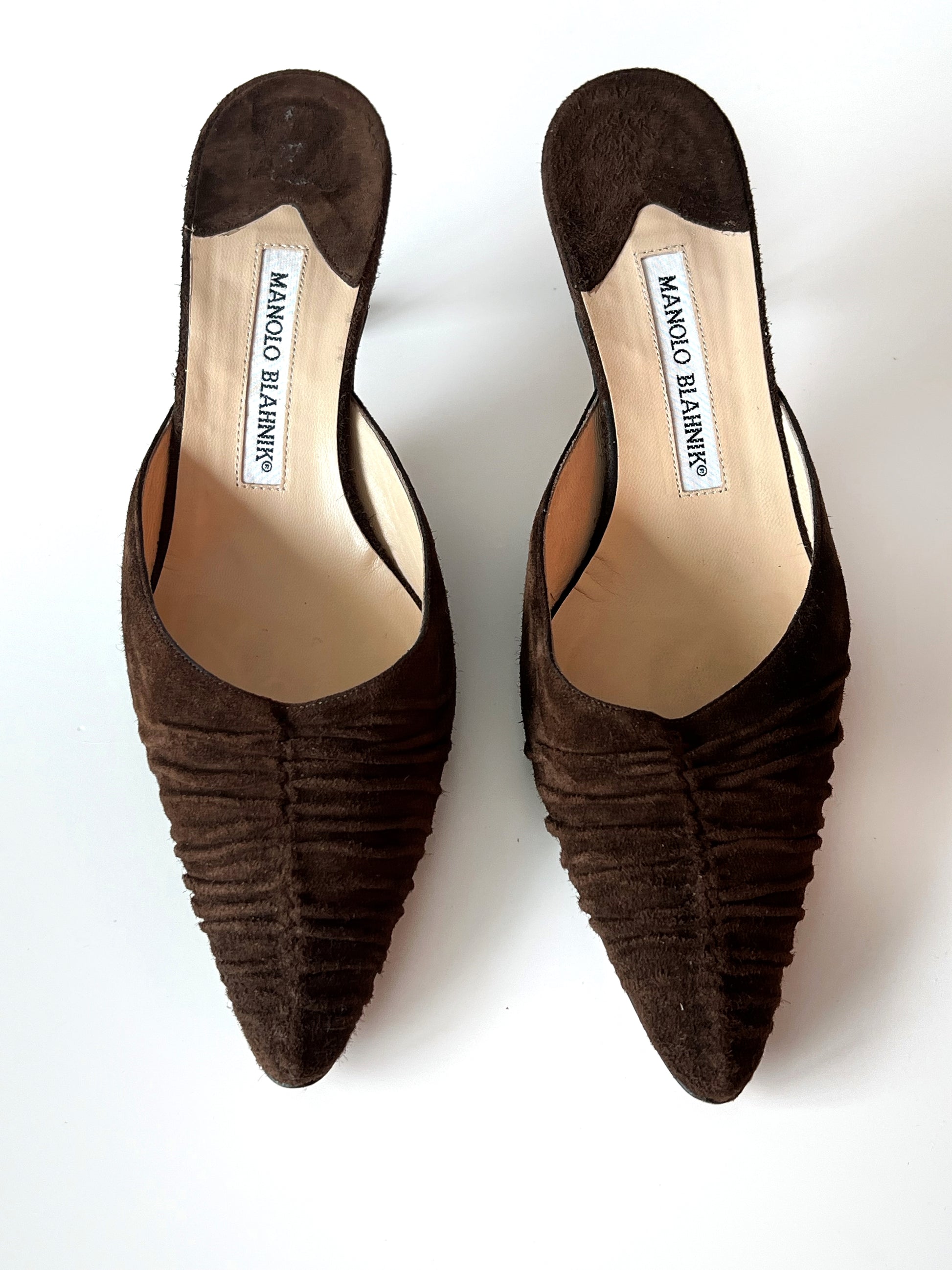 Size 38. Suede Manolo Kitten Heel Mules. Beautiful brown color.