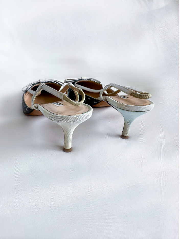 Size 36. Denim Kitten Heels with bows and flower details. Comes with dustbag.