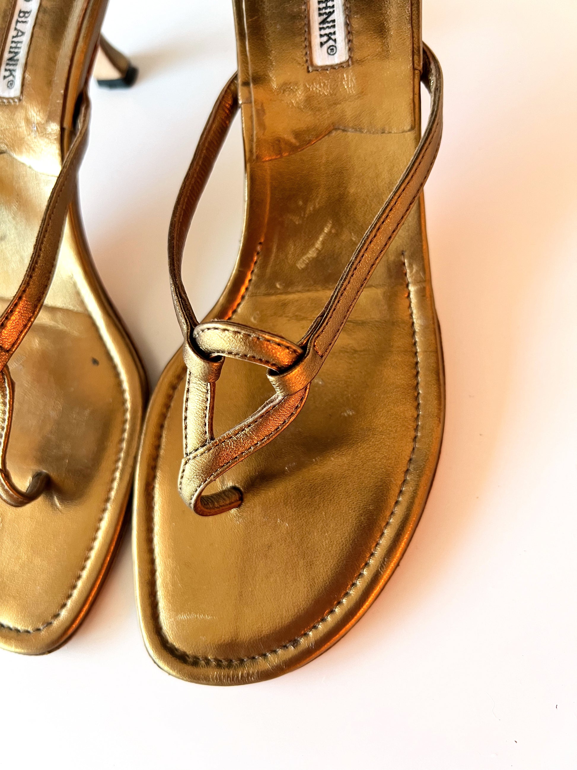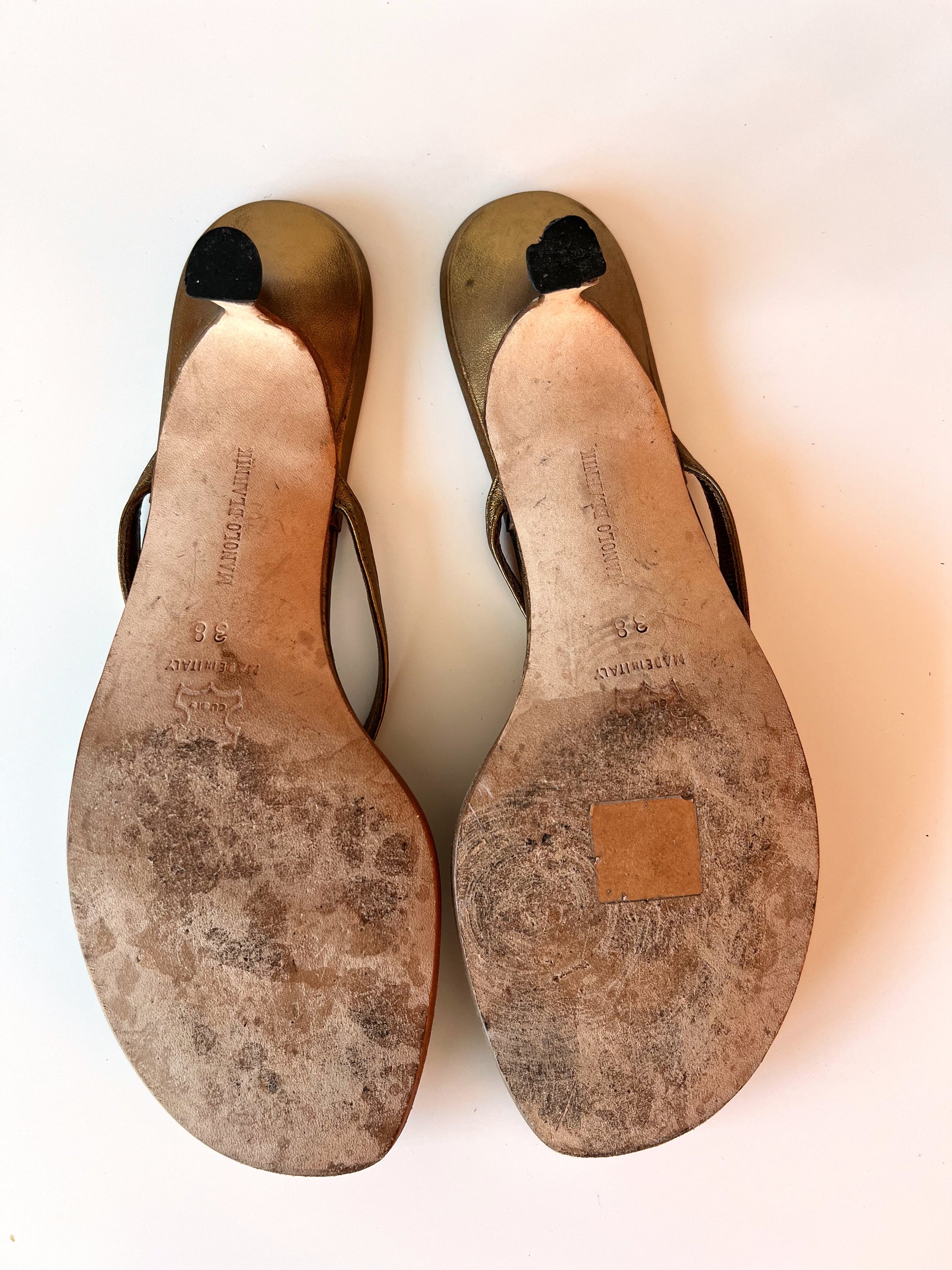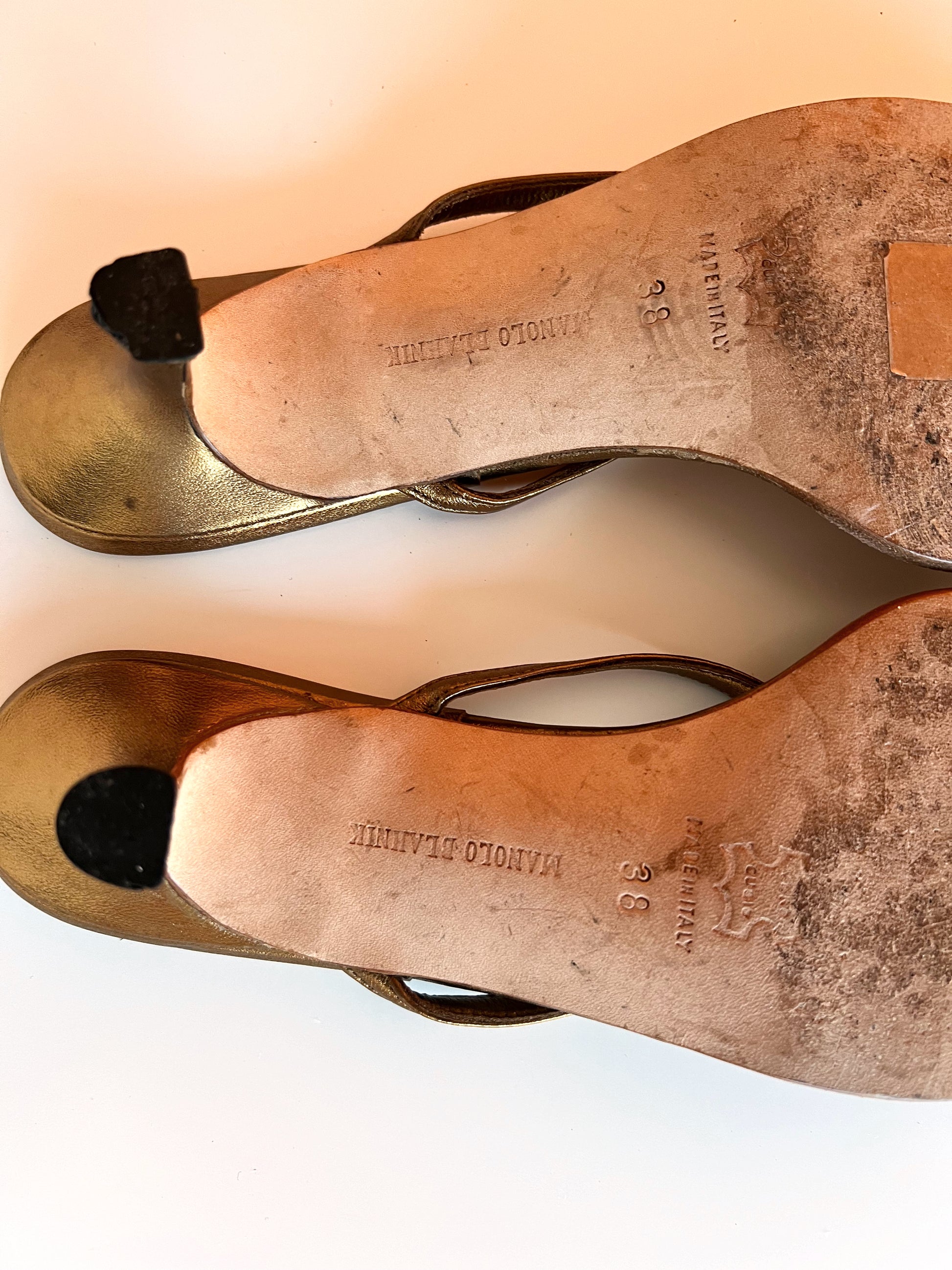 Size 38. Gold Manolo Blahnik Kitten Heel sandals.