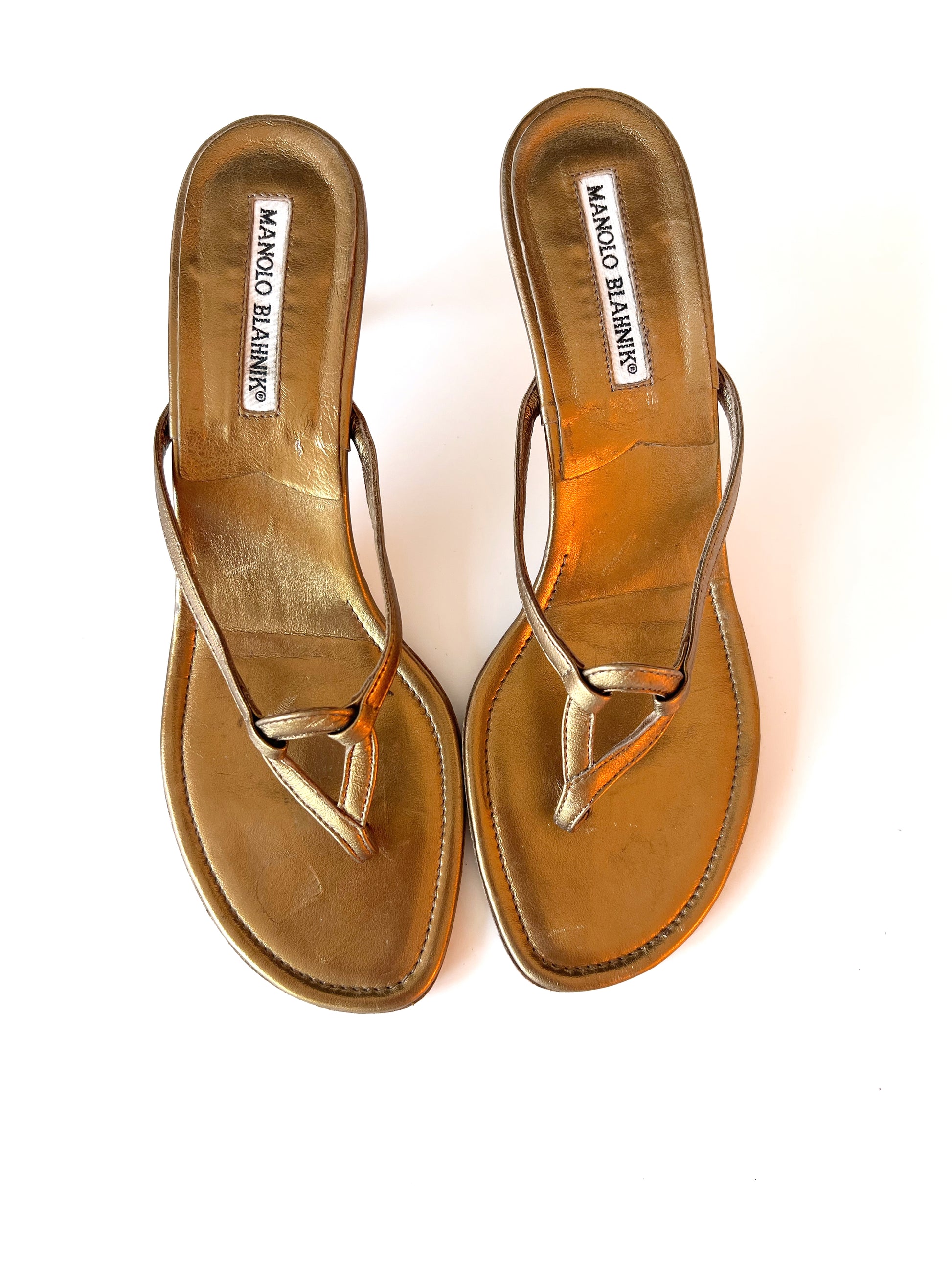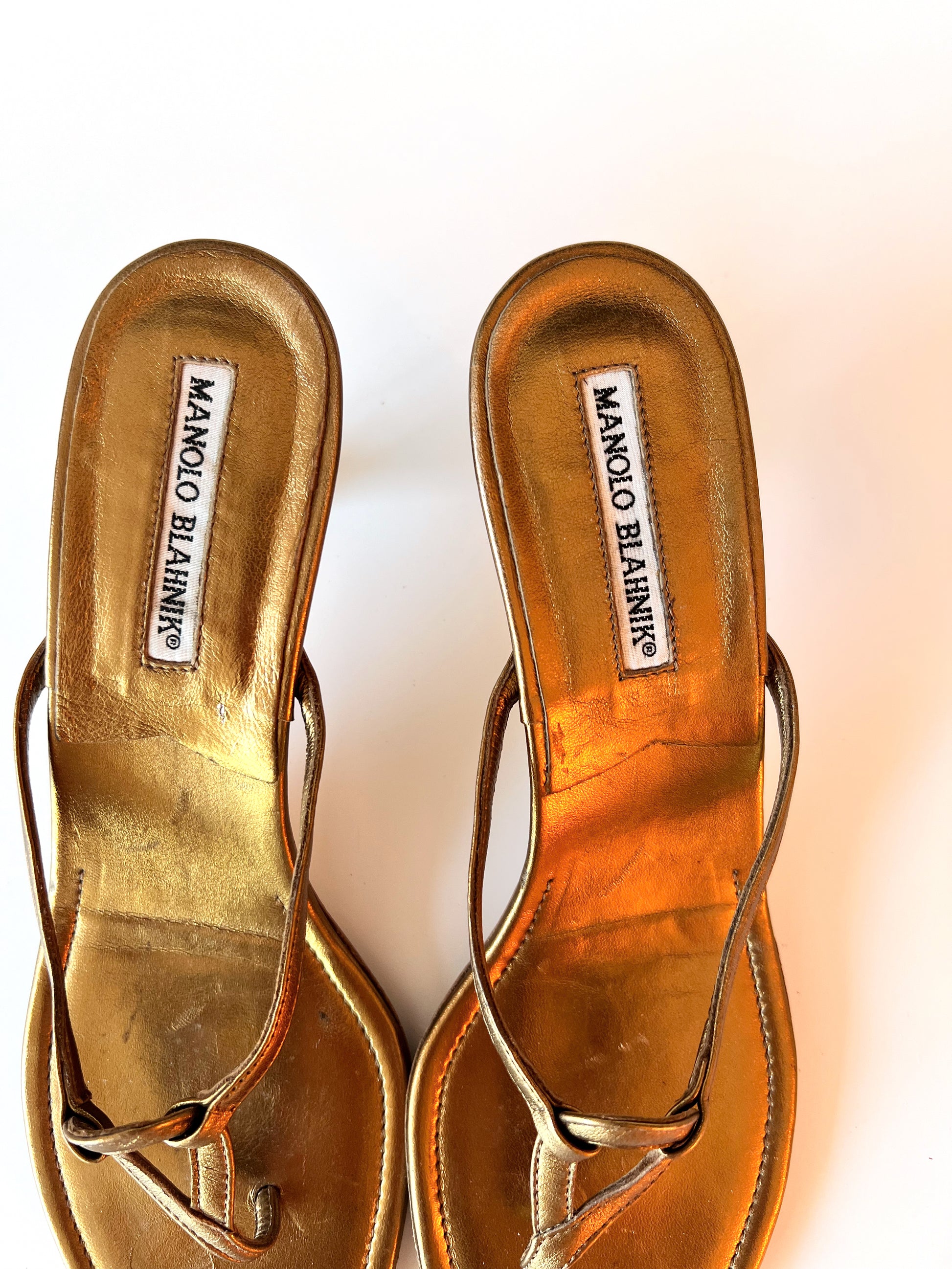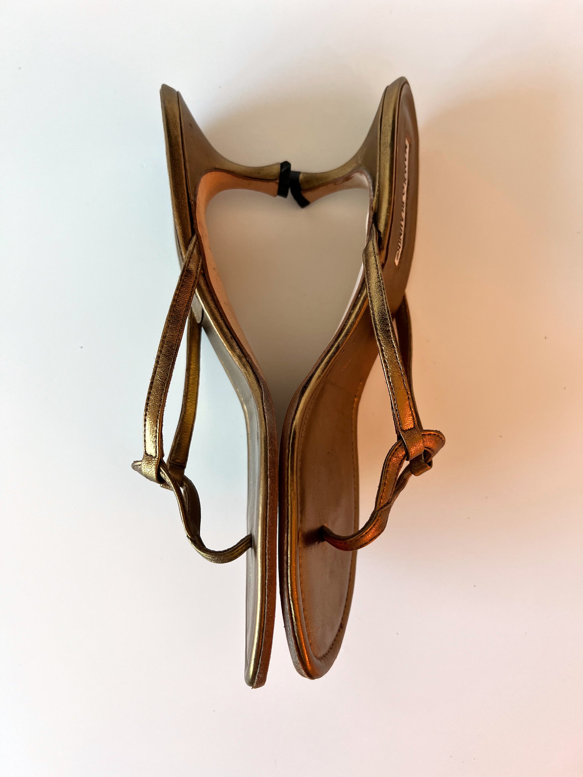 Size 38. Gold Manolo Blahnik Kitten Heel sandals.