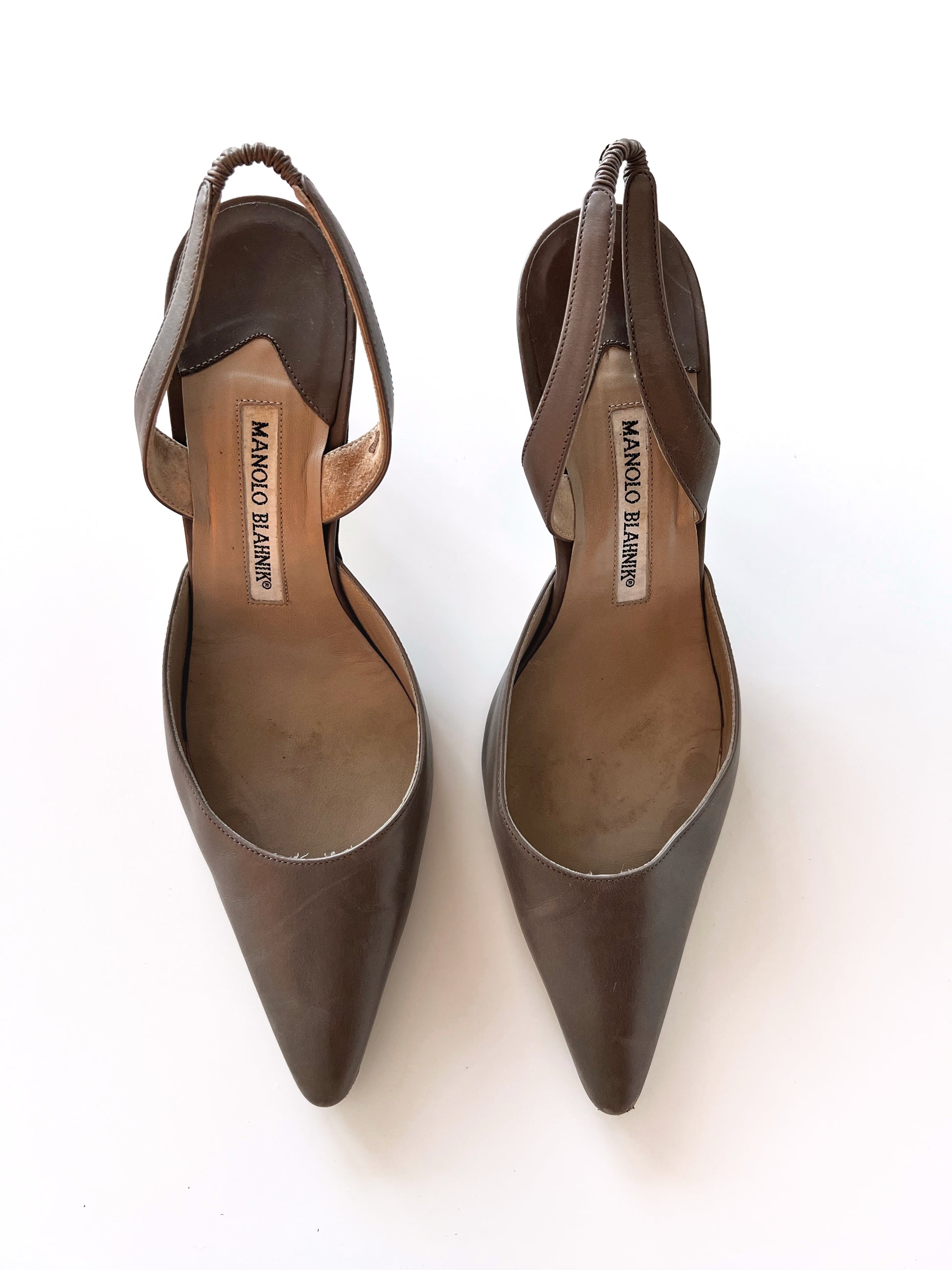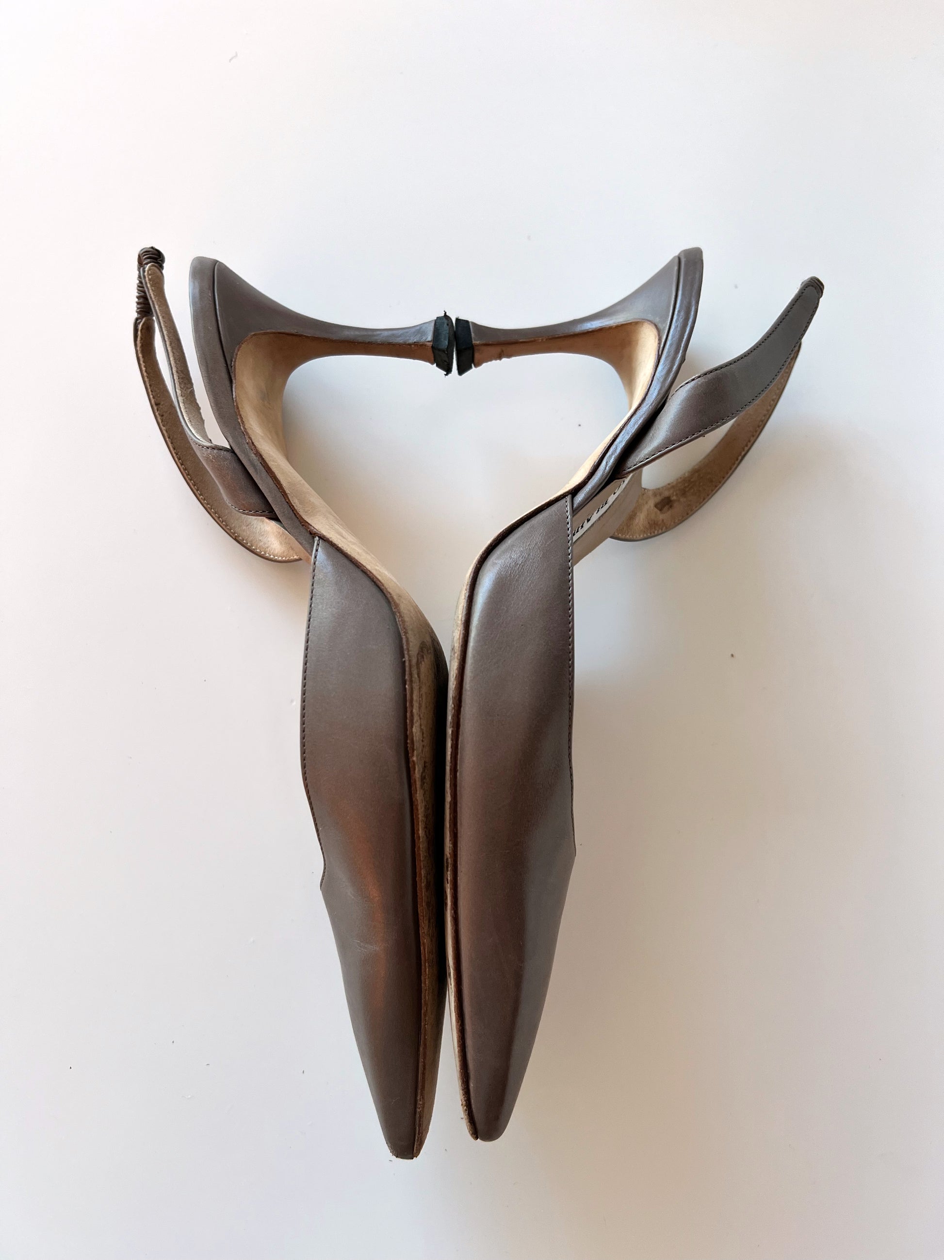 Size 37.5. Grey Manolo Blahnik kitten heel slingback heels.
