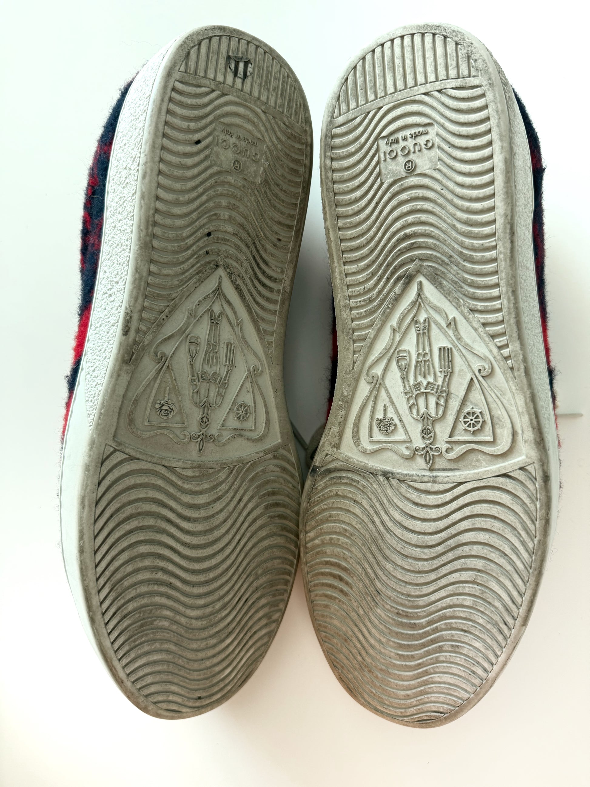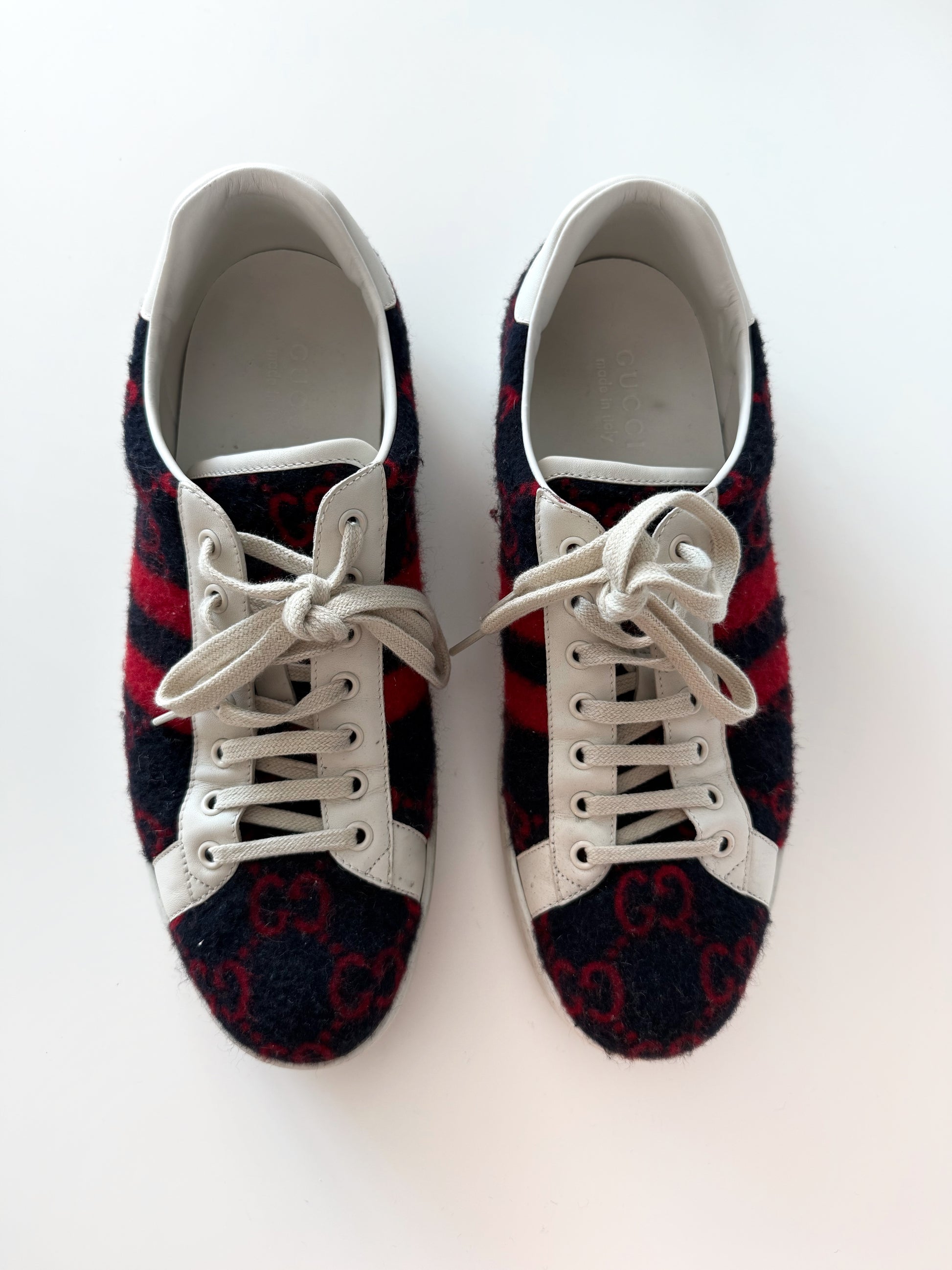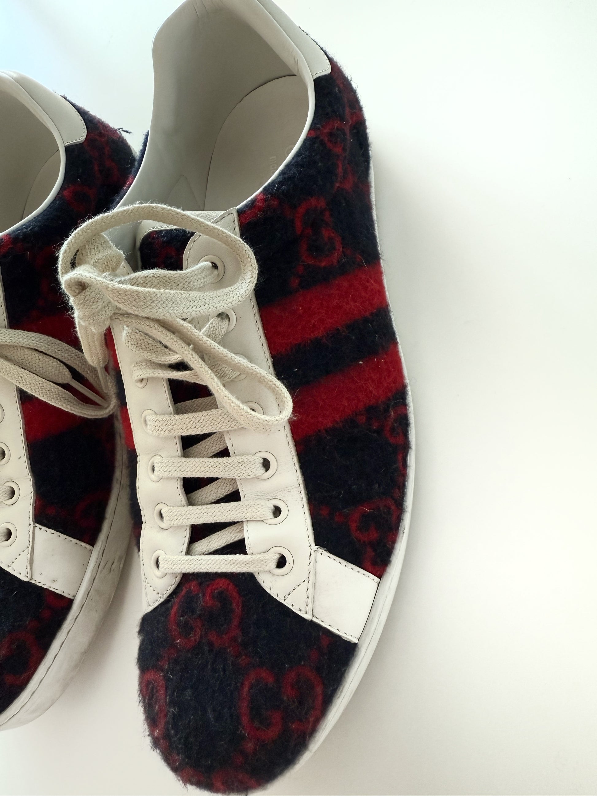 Size 10 US. Navy Blue and red Gucci wool sneakers with logo detailing.