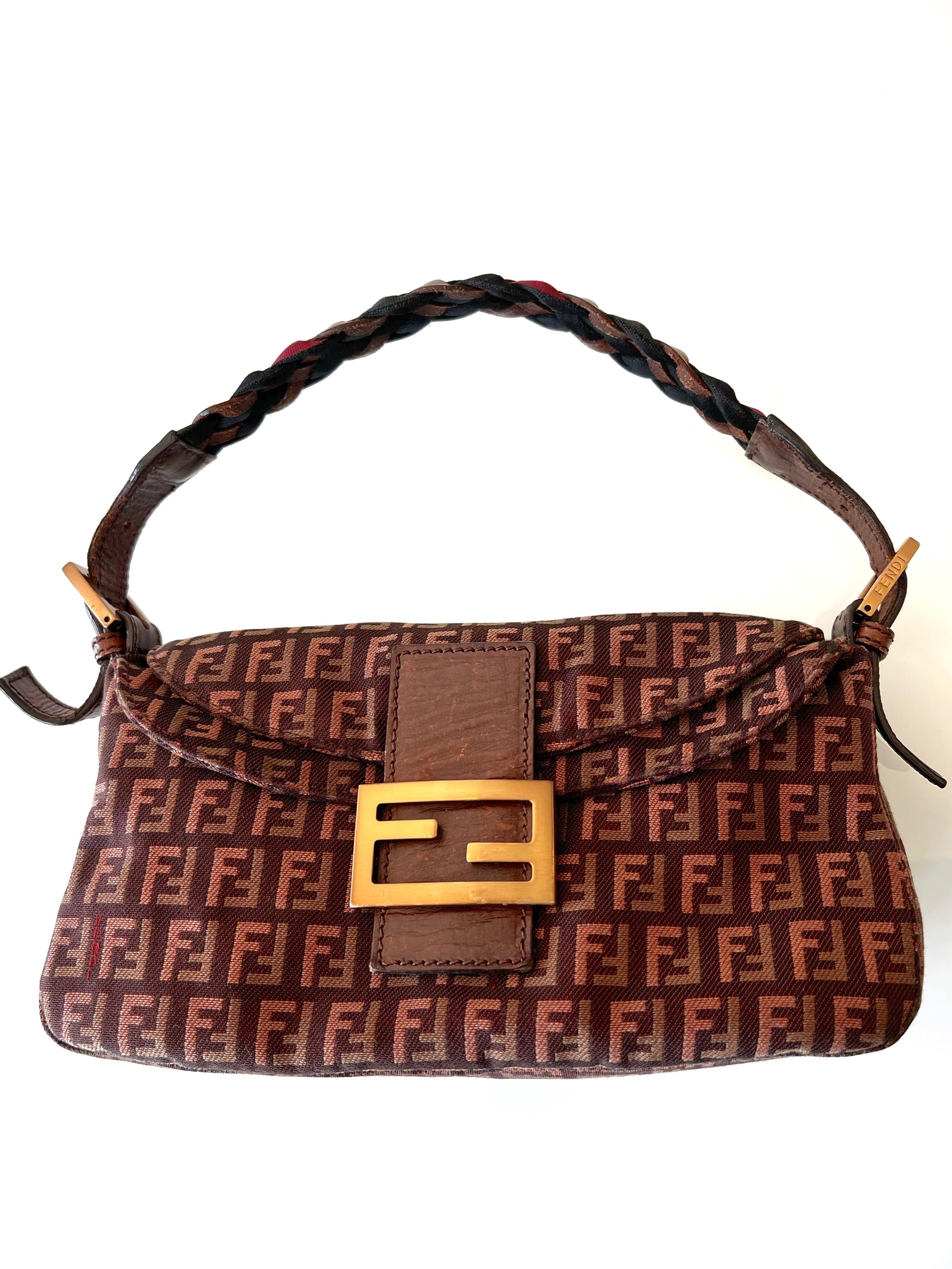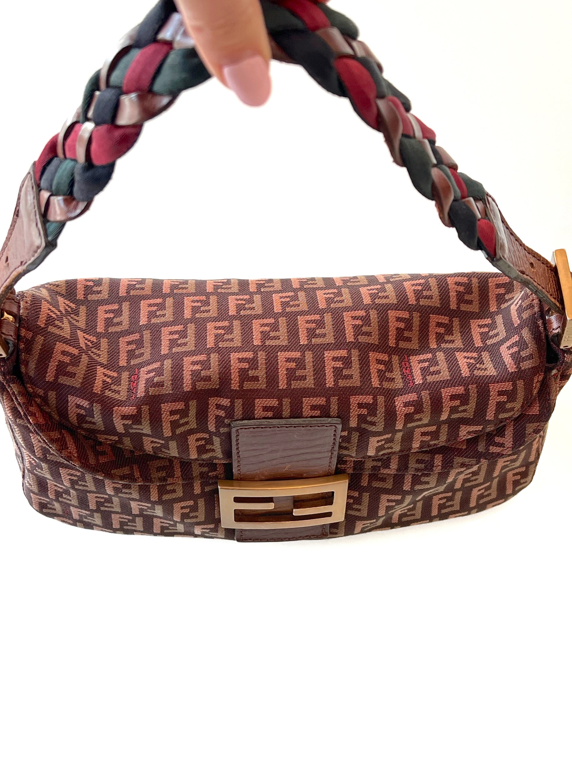 Maroon Fendi Monogram Baguette with woven shoulder strap. Perfect fall bag.