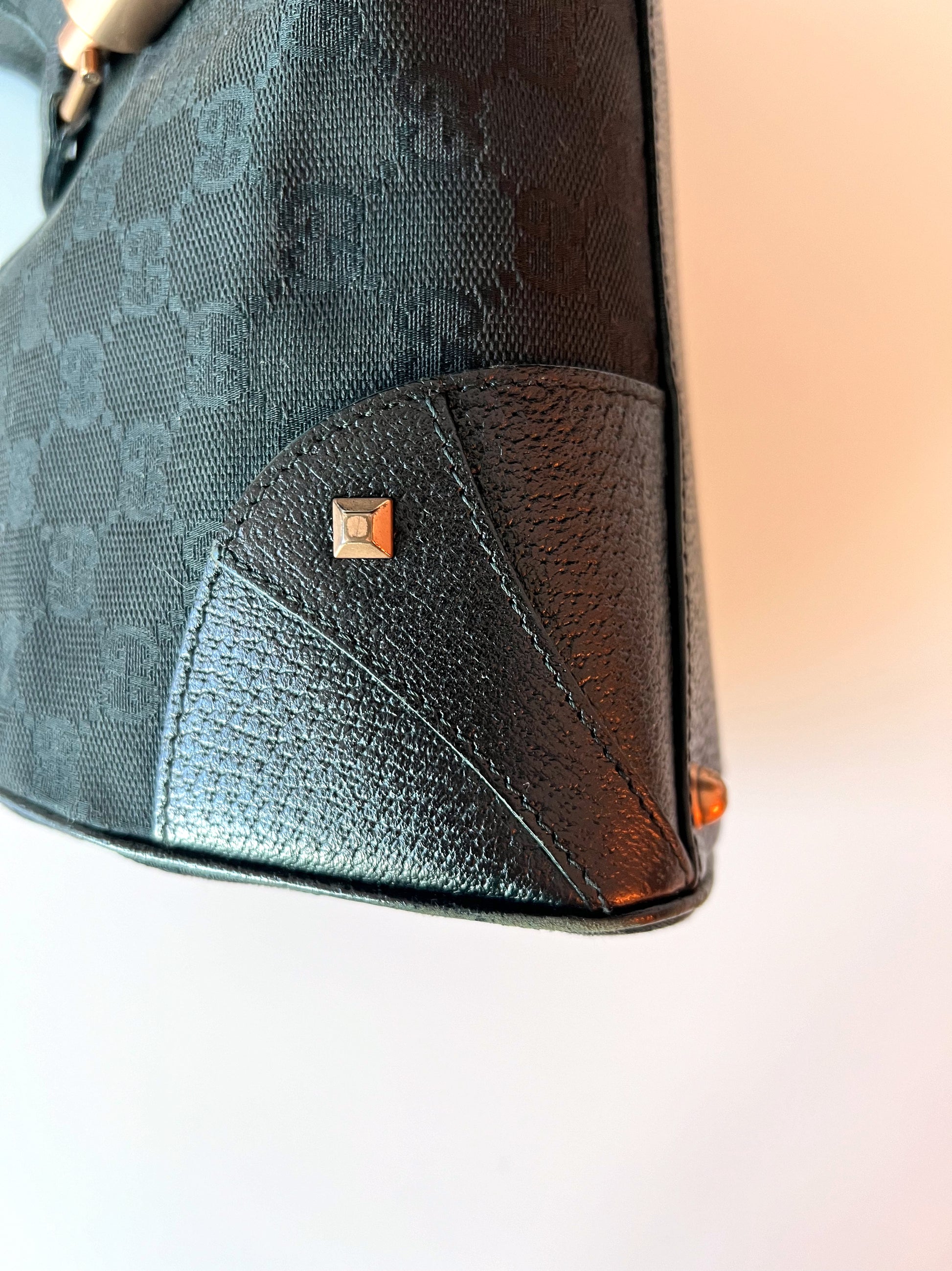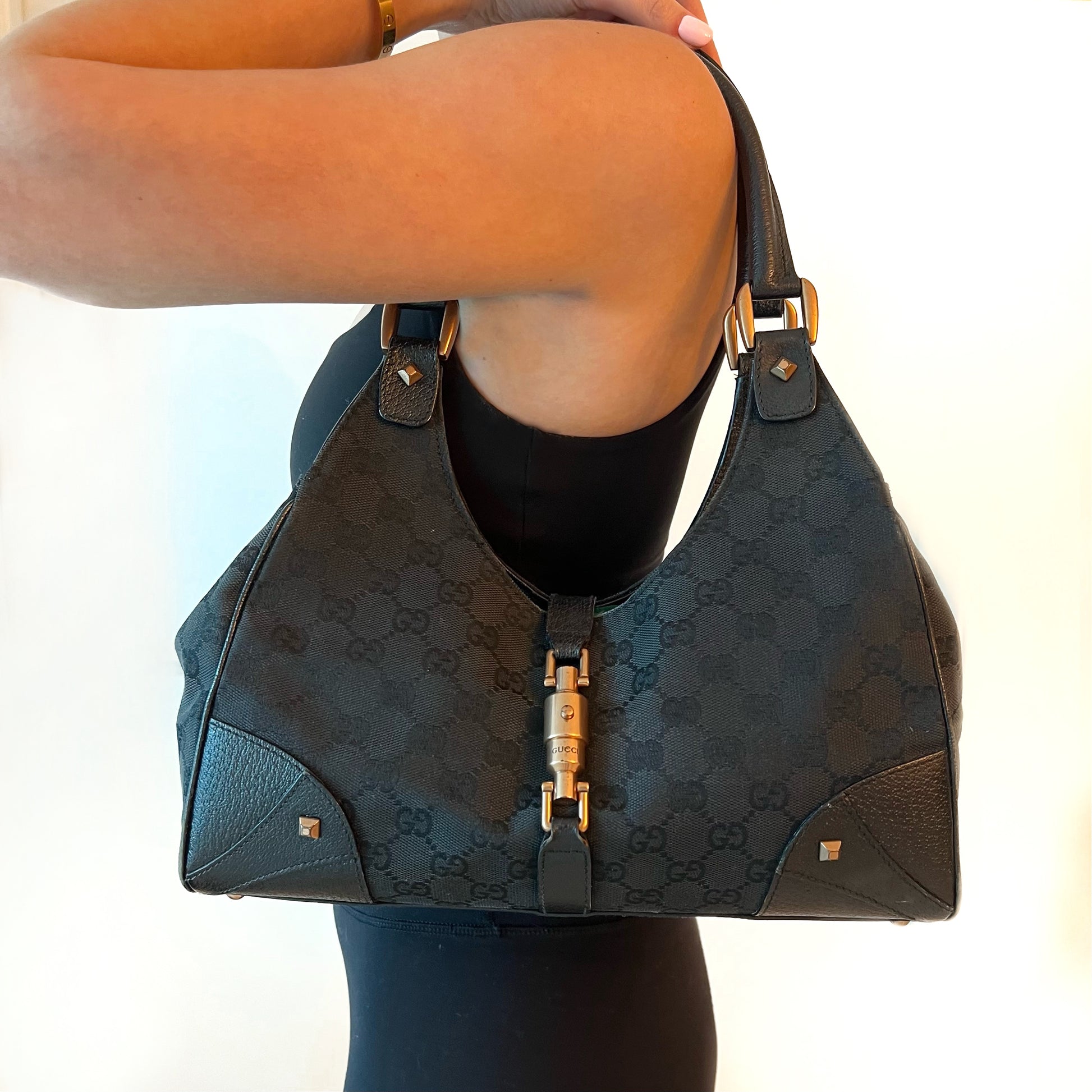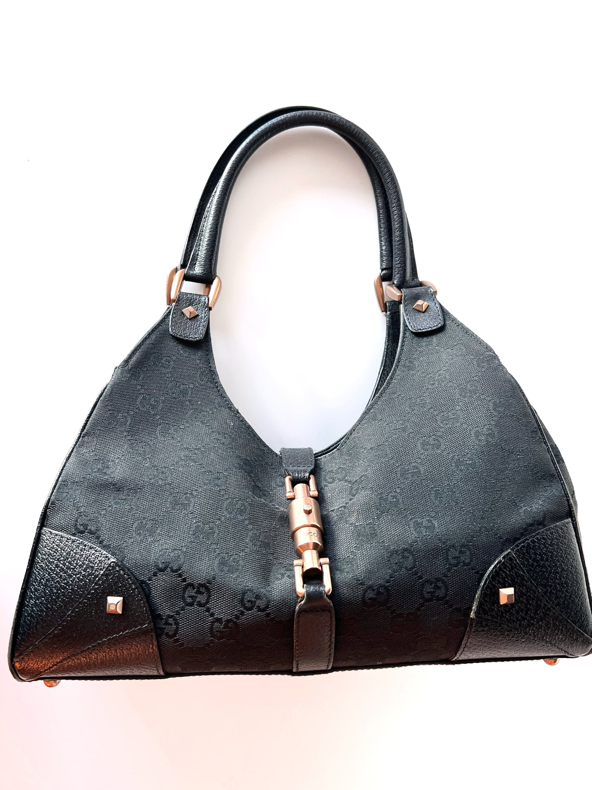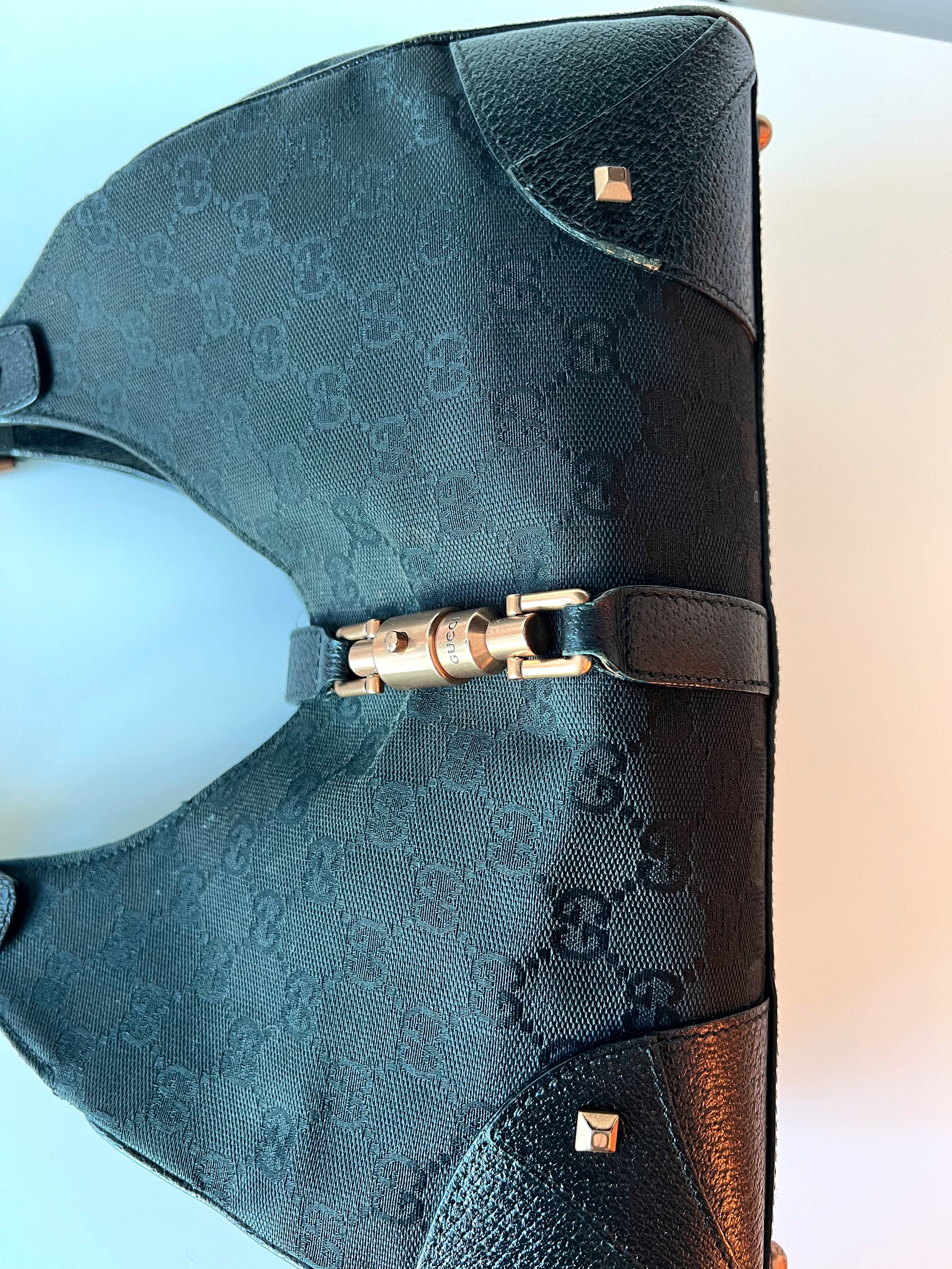 Medium black Gucci Jackie tote. Monogram print with leather corners and straps.