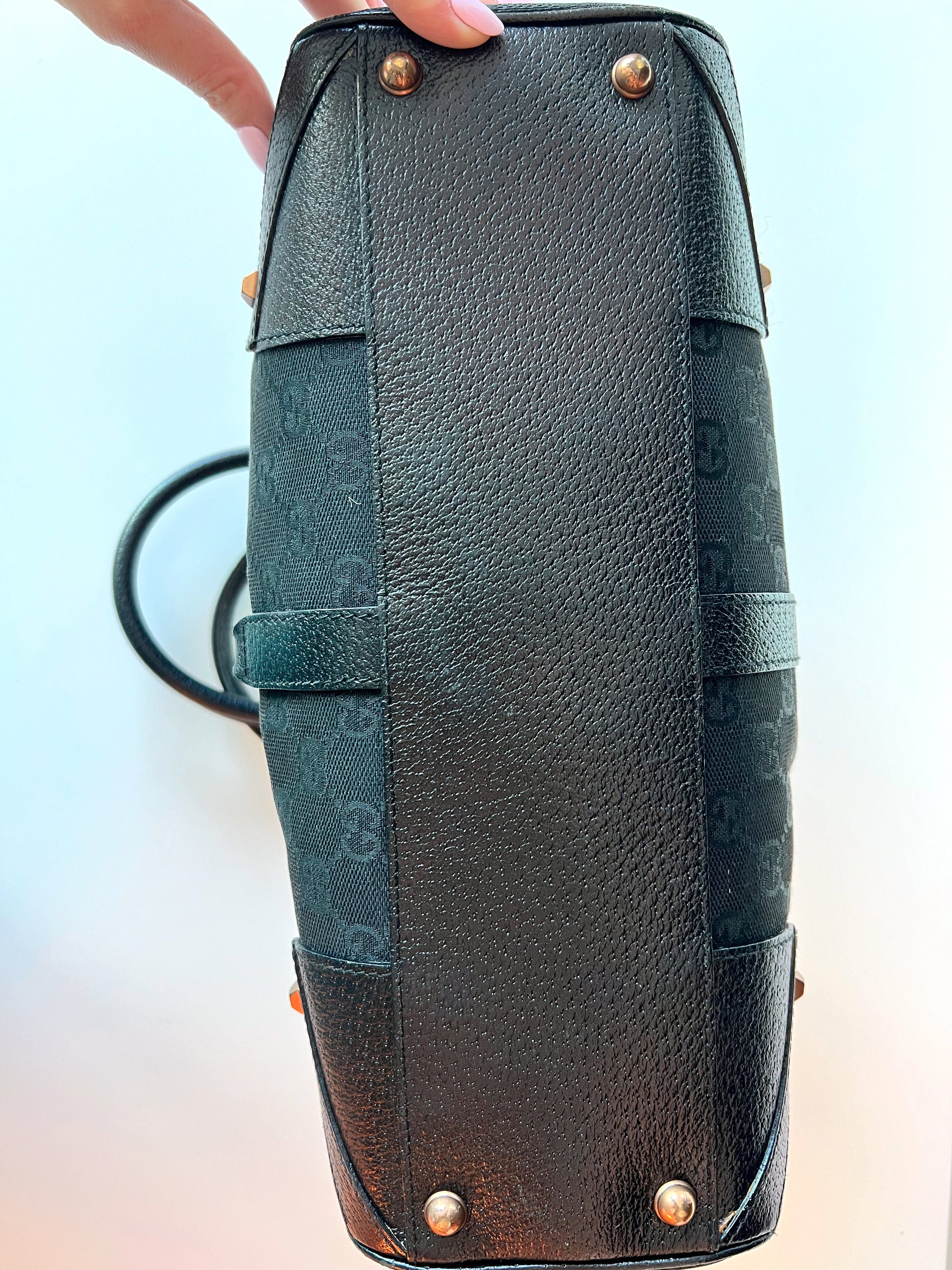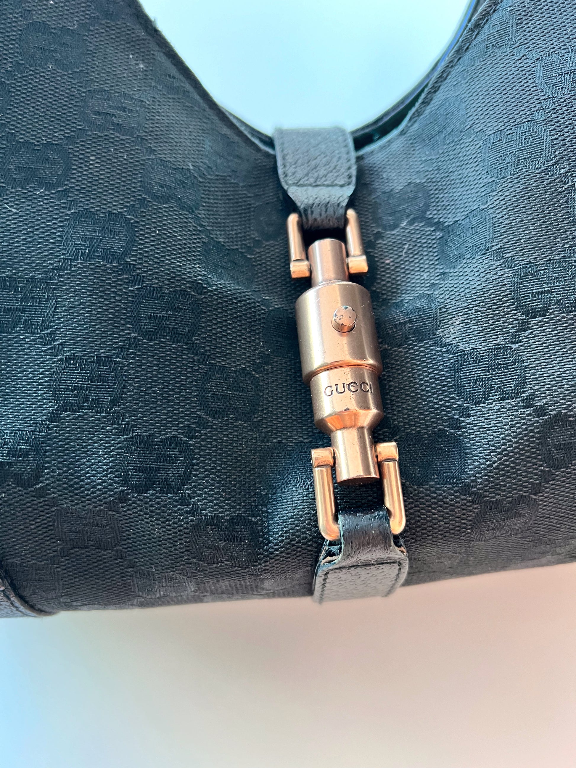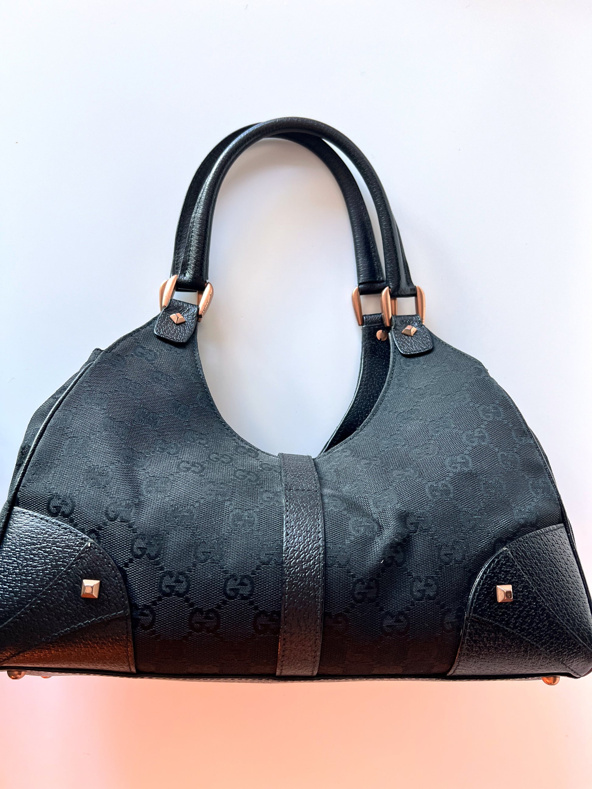 Medium black Gucci Jackie tote. Monogram print with leather corners and straps.