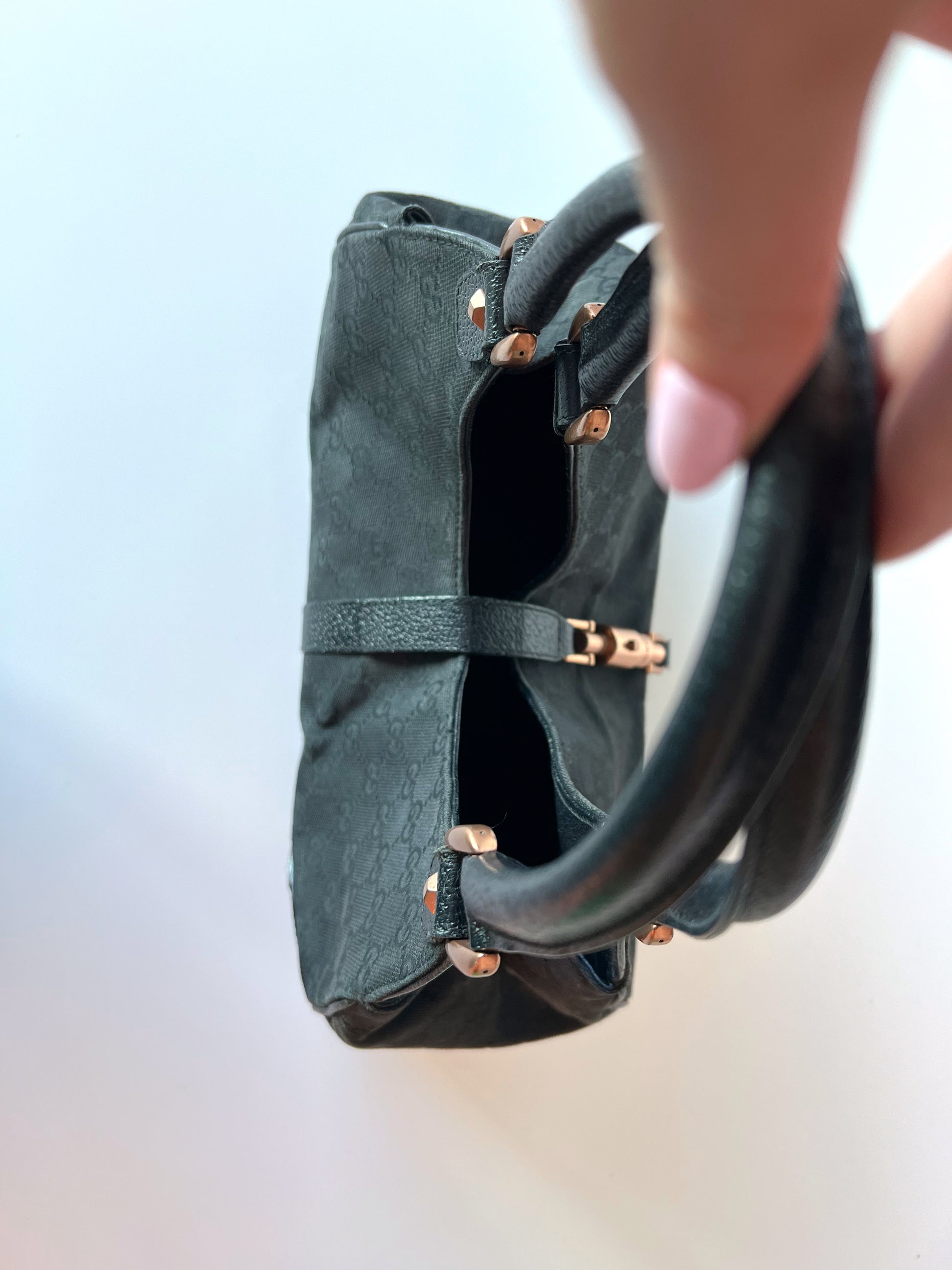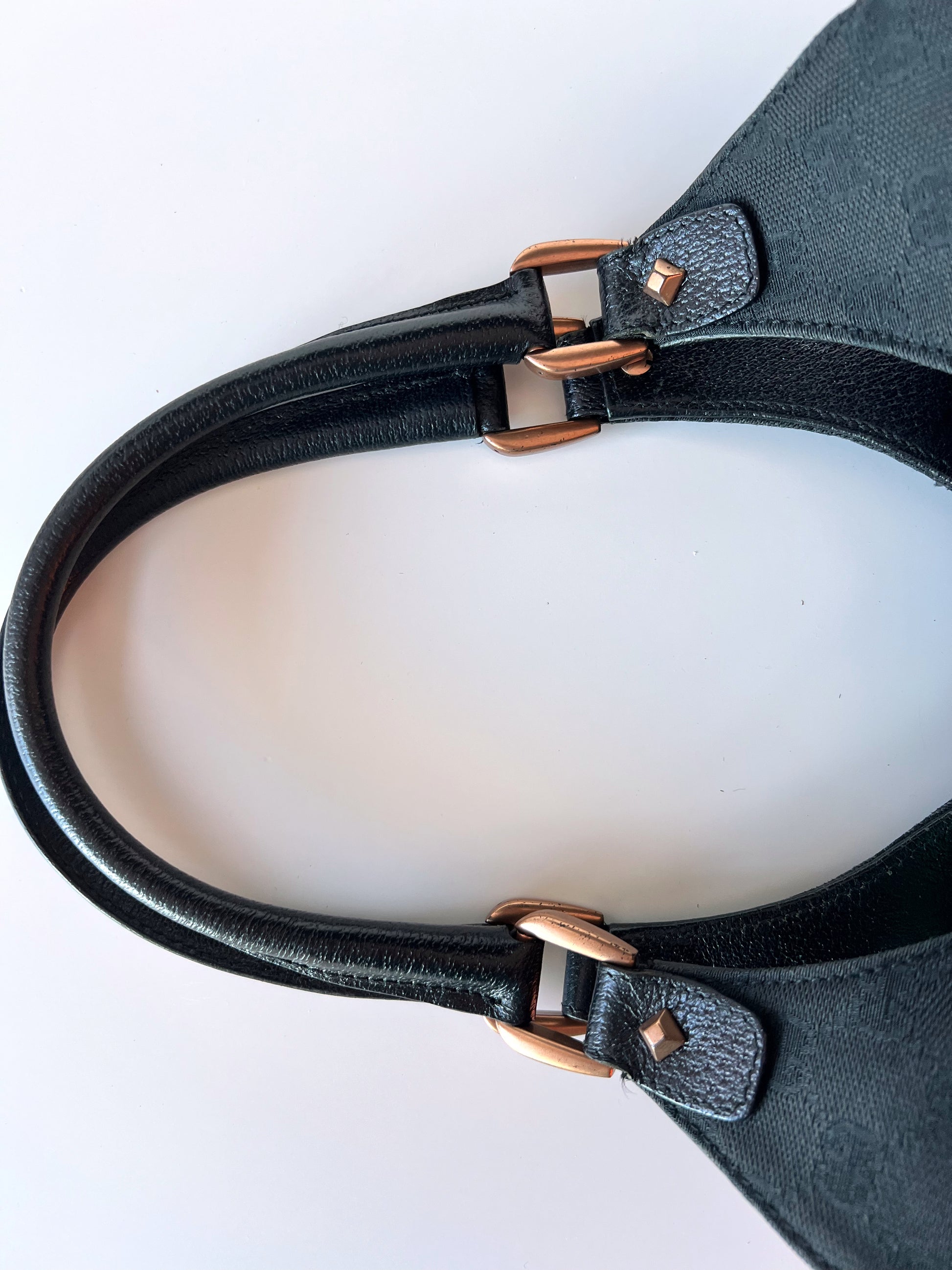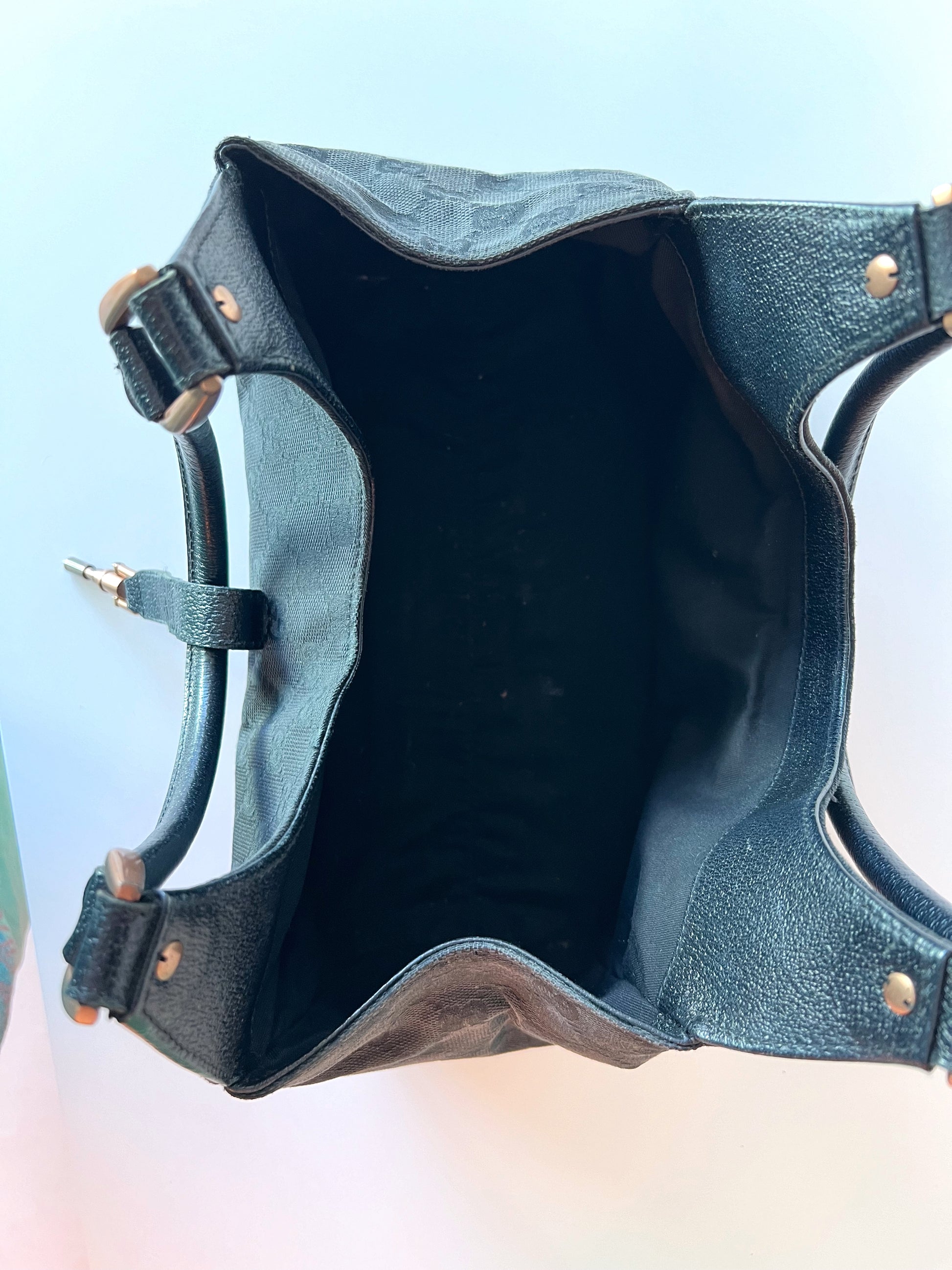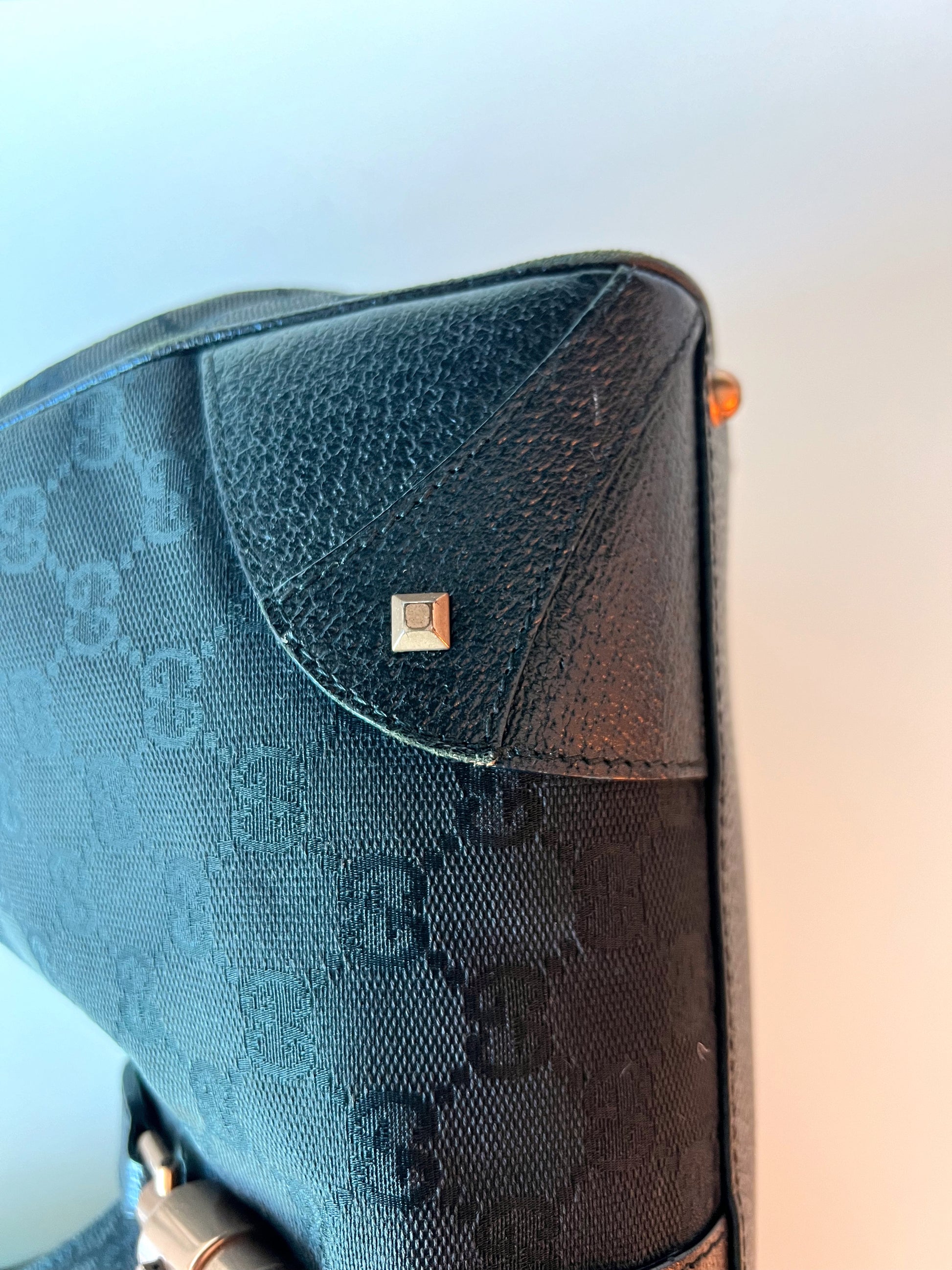 Medium black Gucci Jackie tote. Monogram print with leather corners and straps.