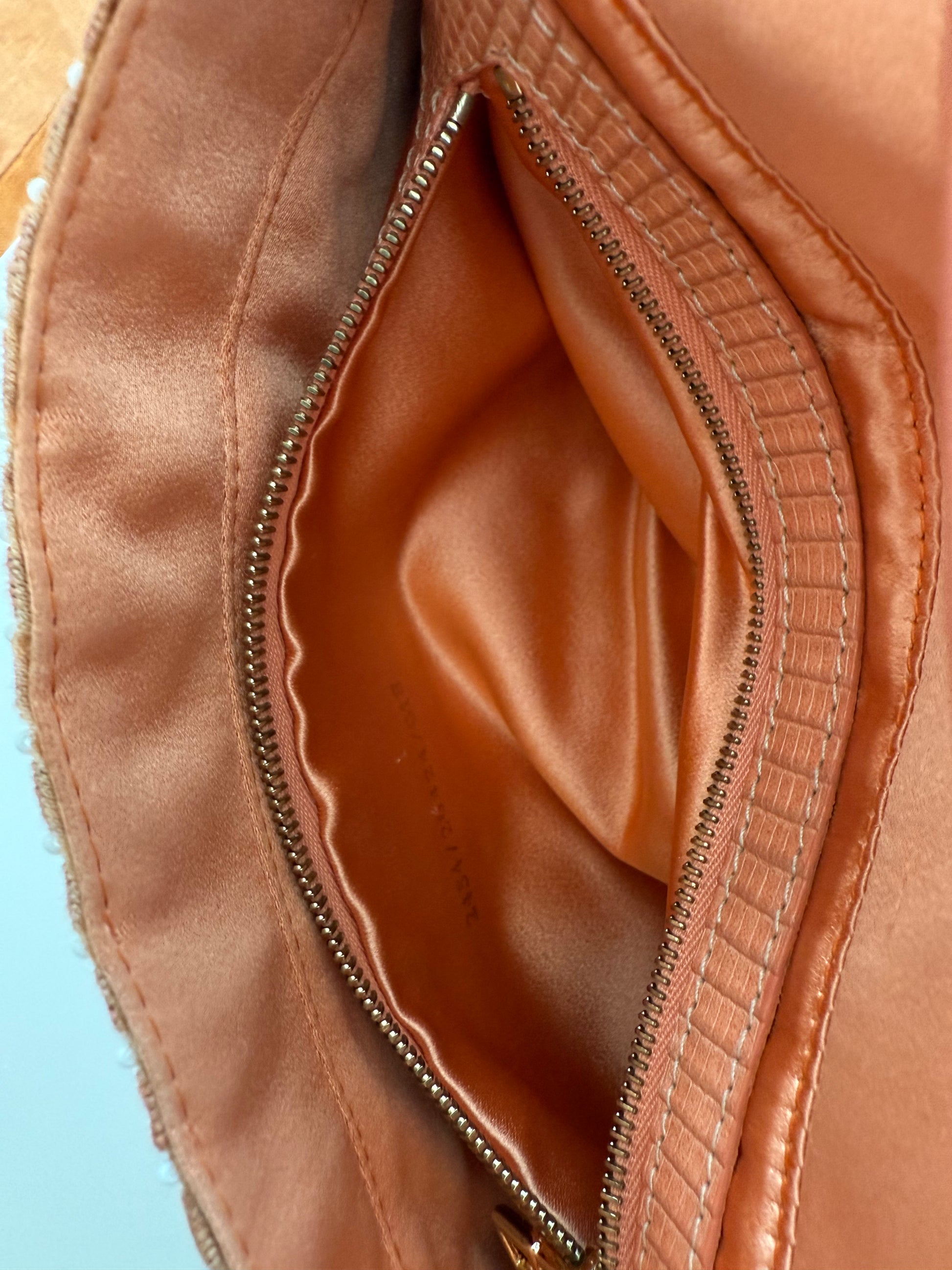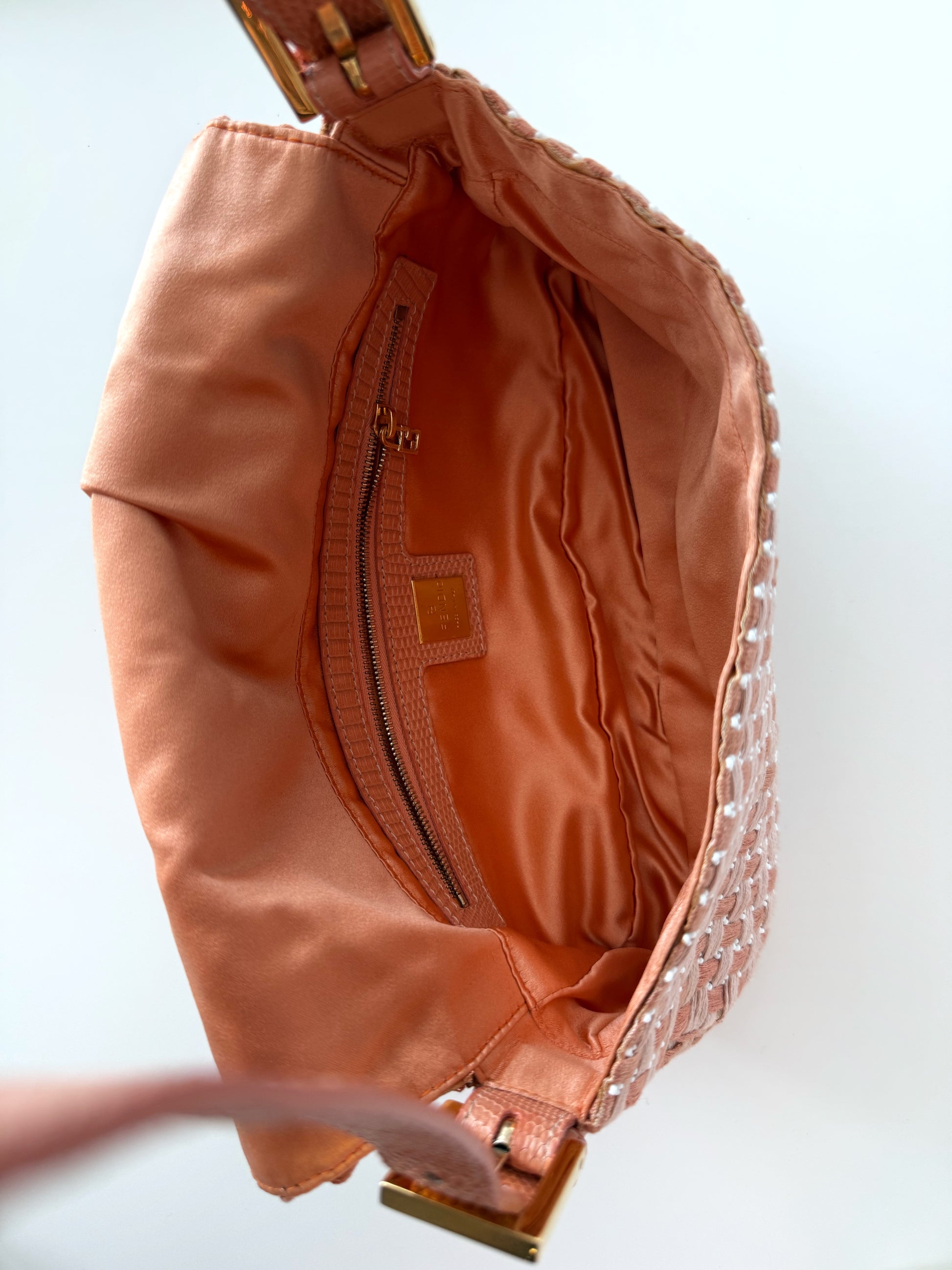 Pink and orange iconic Fendi Baguette. Rare woven and beaded bag with python and rose quartz clasp. Silk interior. Comes with original dustbag and extra beads.