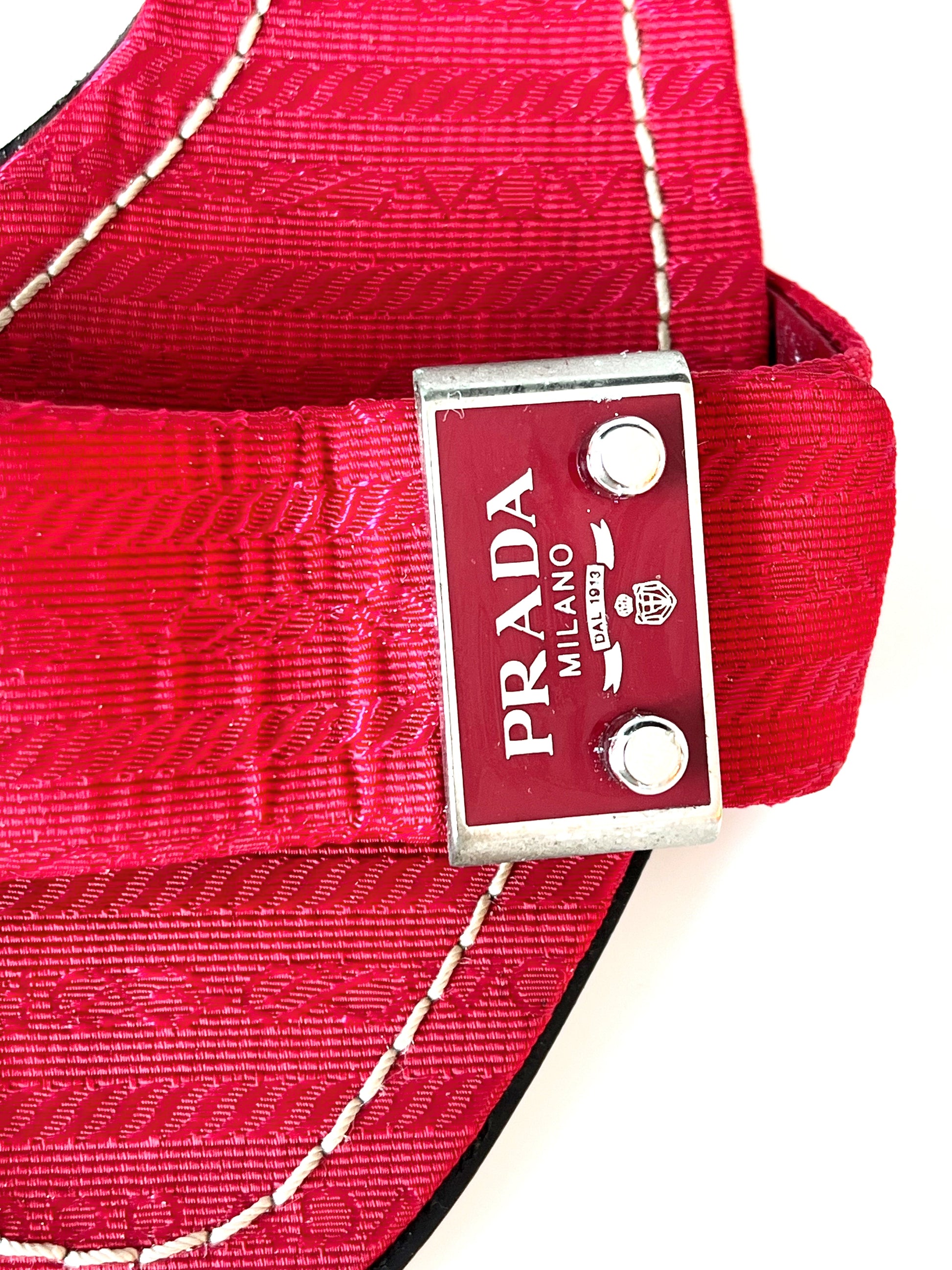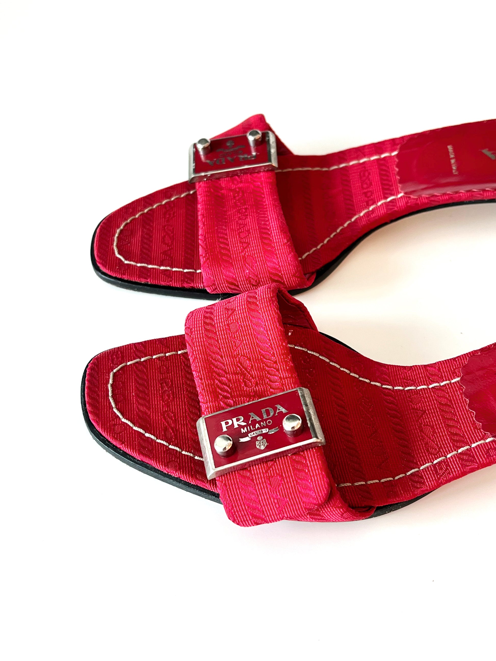 Size 36. Red fabric Prada mules. Prada logo on front strap. Short kitten heel.