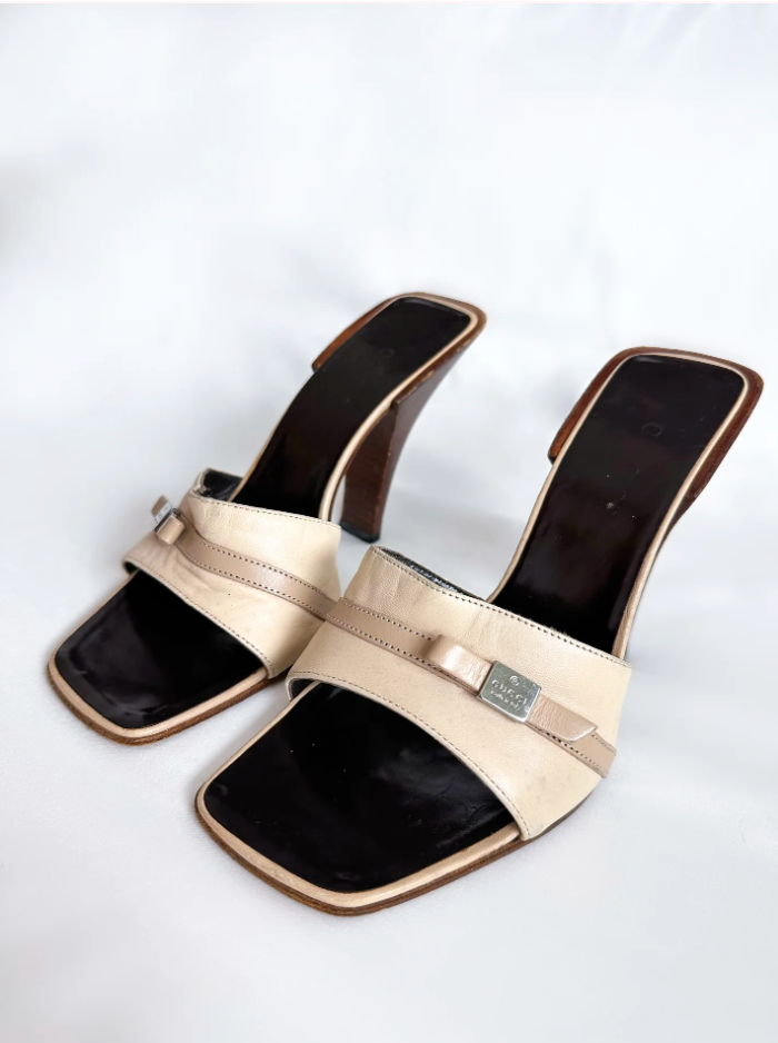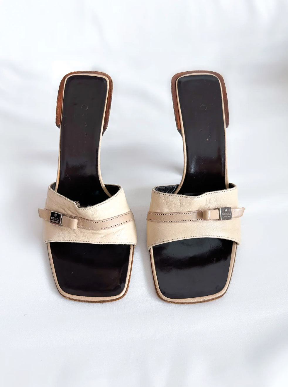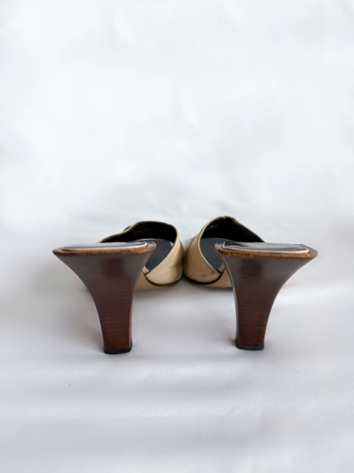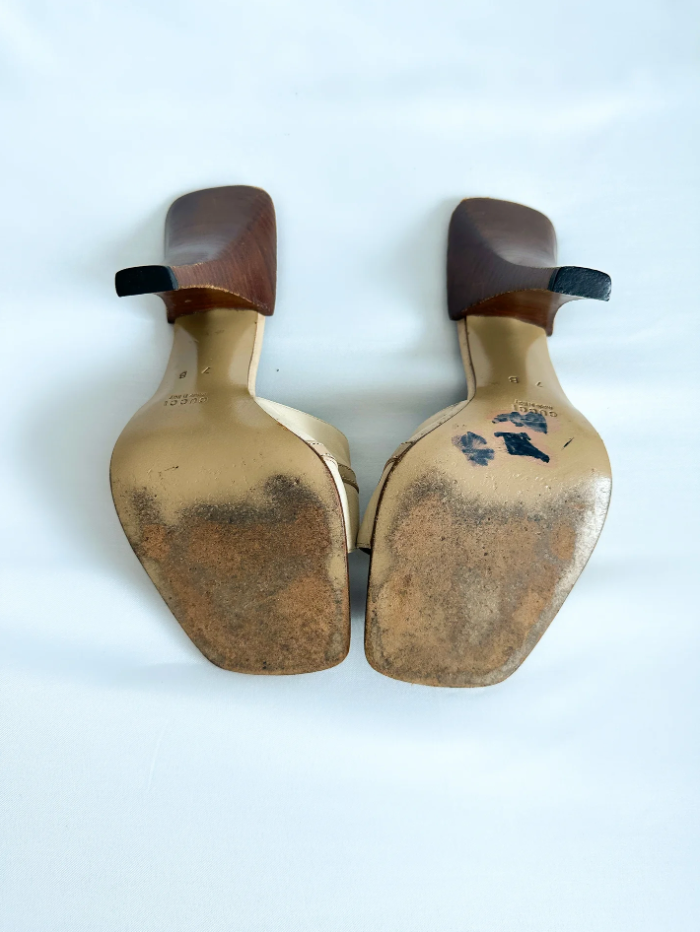 Size 7B. Tan leather Gucci mules with wooden heels.