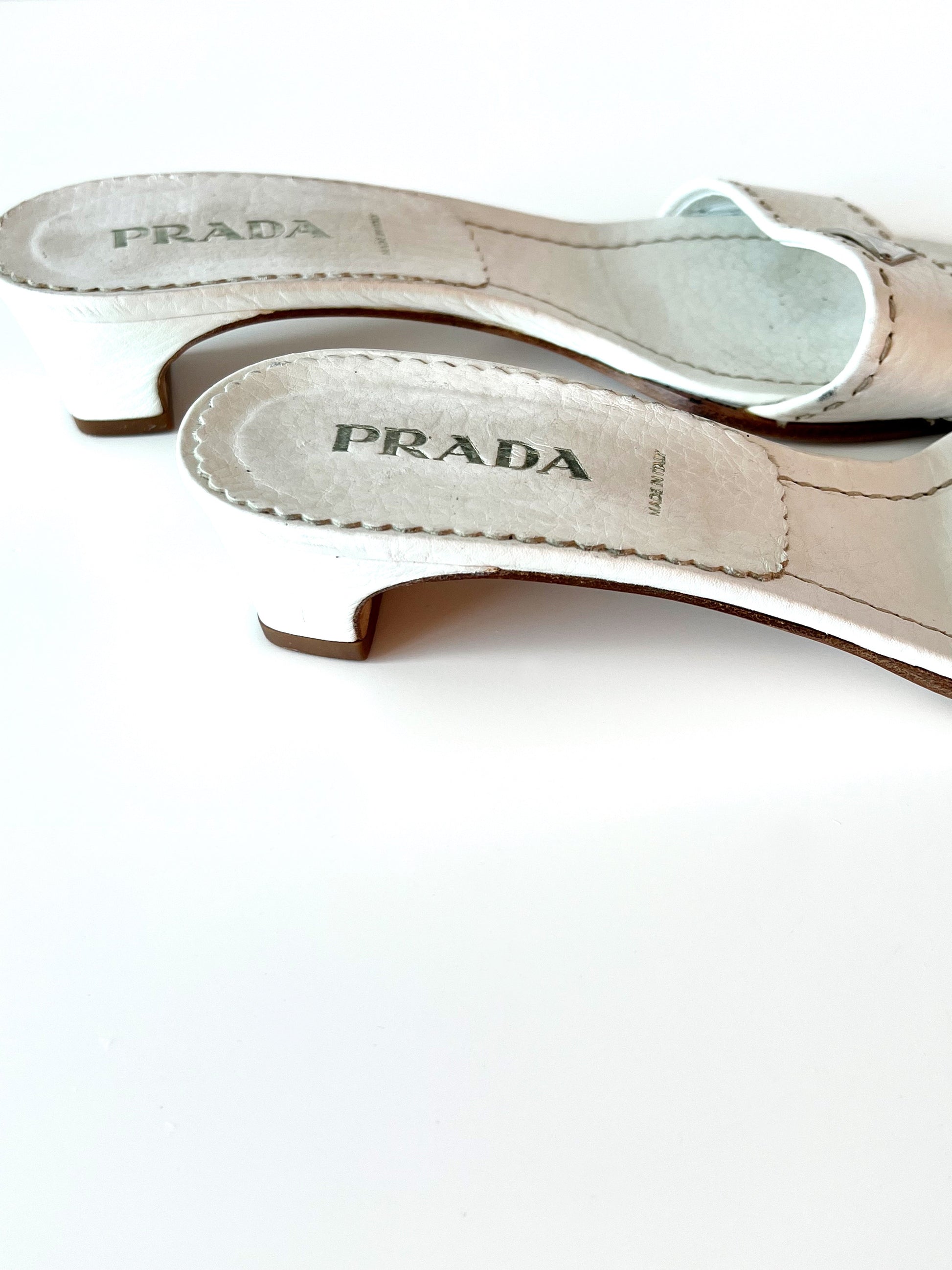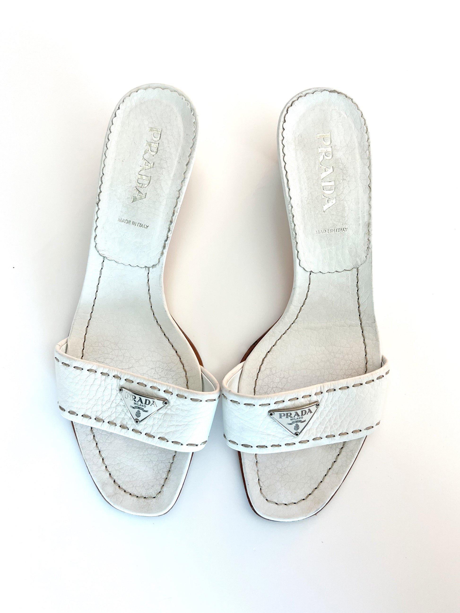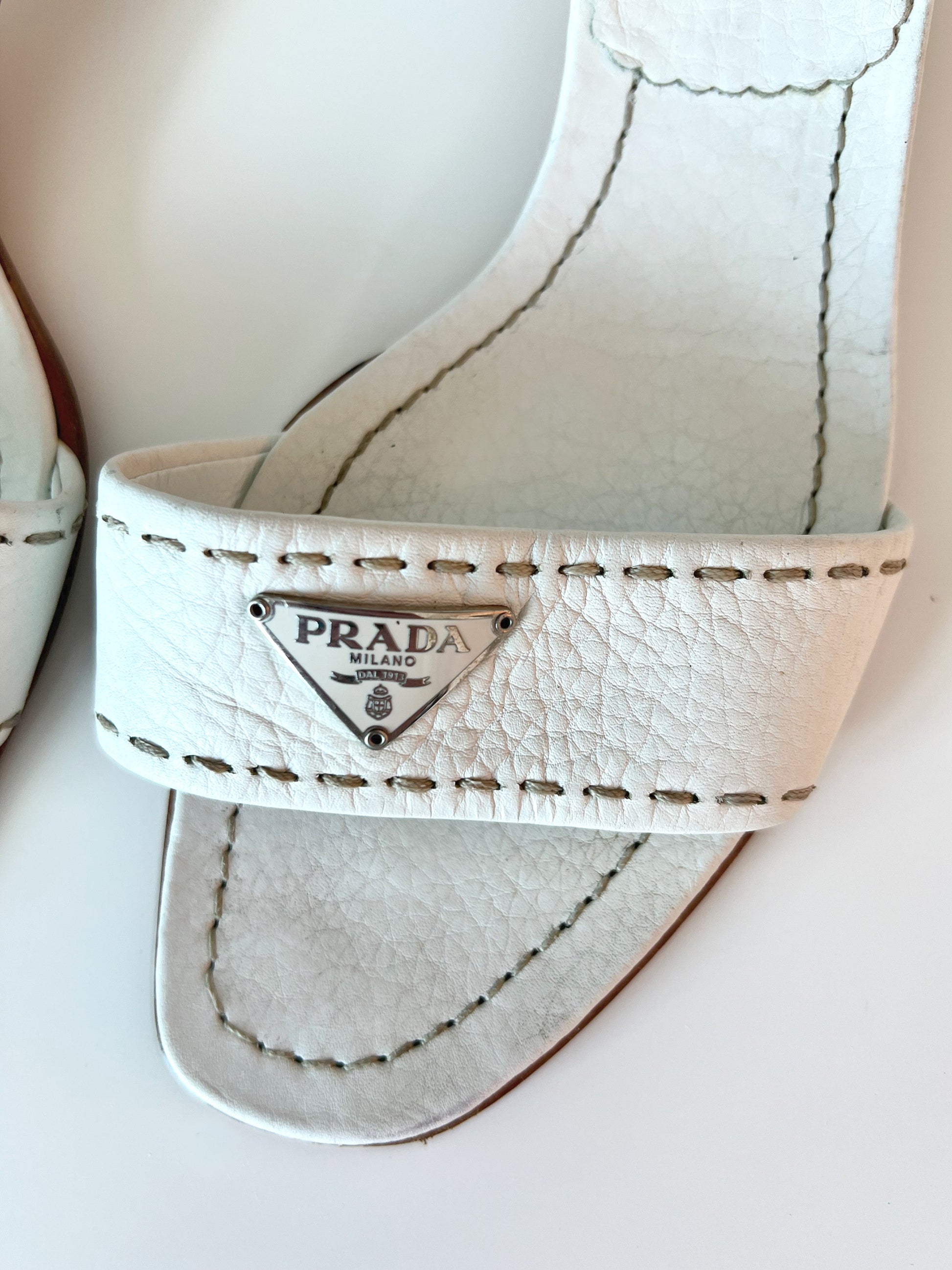 Size 38. White leather Prada mules. Prada logo on front strap. Short kitten heel.